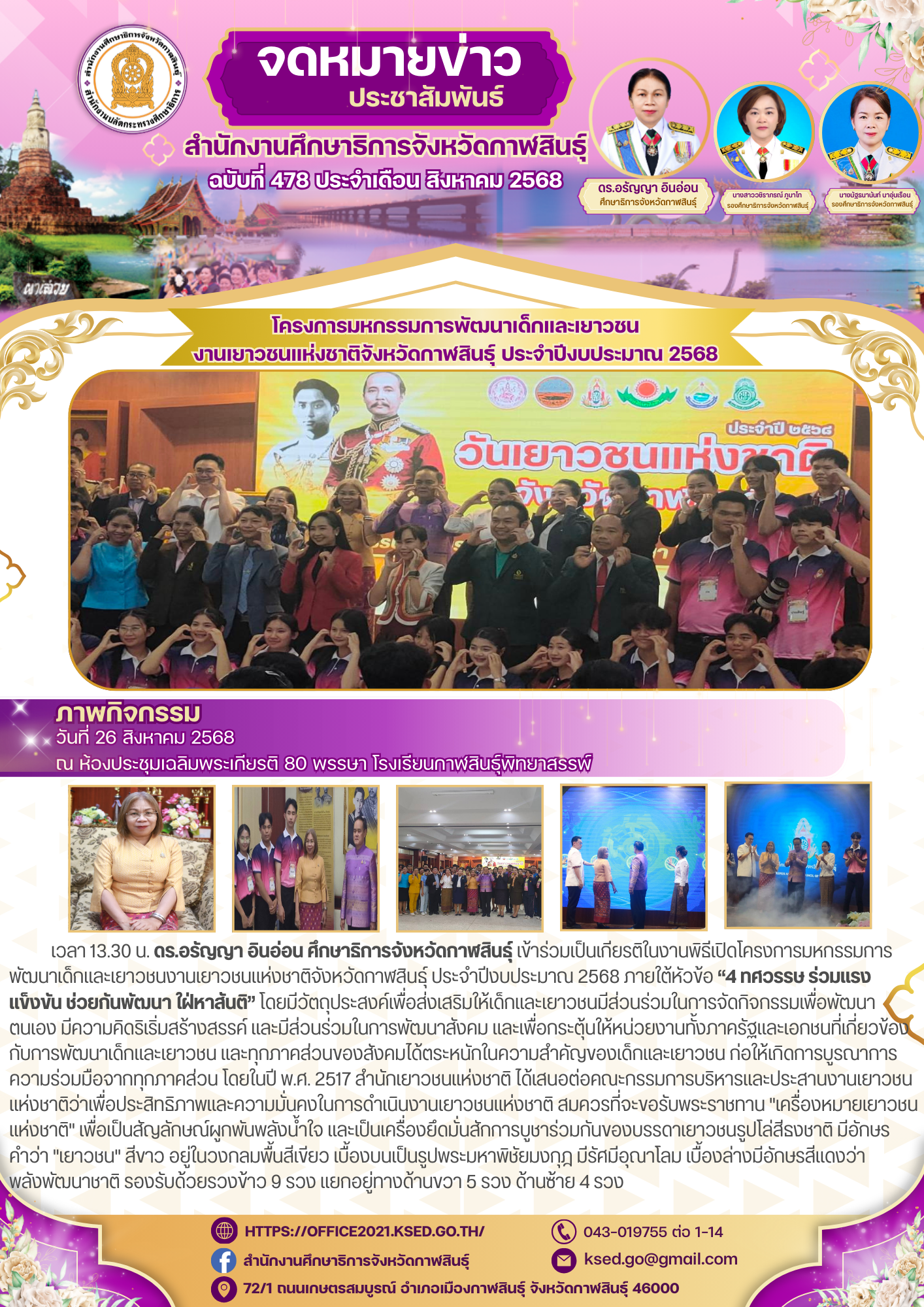 พิธีเปิดโครงการมหกรรมการพัฒนาเด็กและเยาวชนงานเยาวชนแห่งชาติจังหวัดกาฬสินธุ์ ประจำปีงบประมาณ 2568โดย : นายสุวิทย์ ปะกาเวสา26 สิงหาคม 2568
