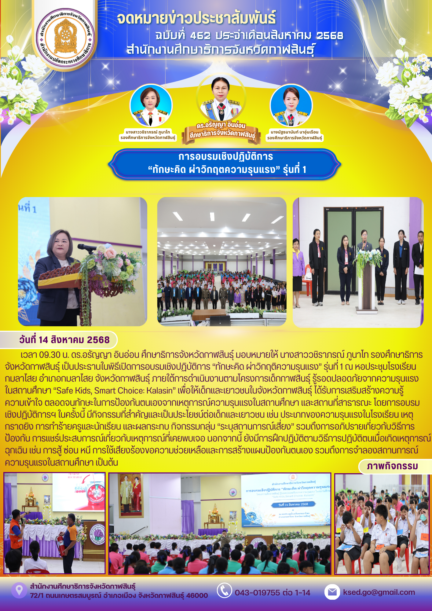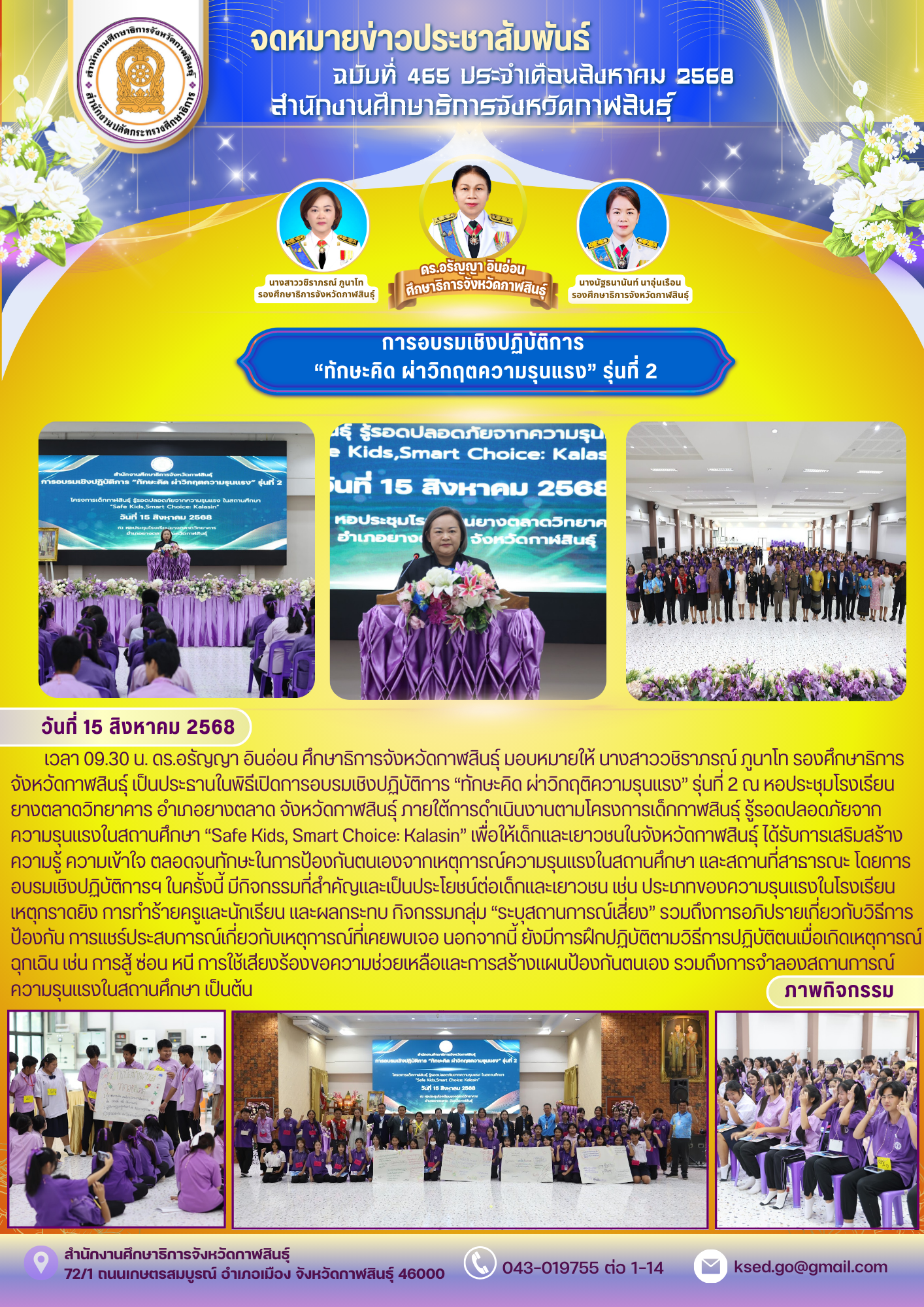 การอบรมเชิงปฏิบัติการ “ทักษะคิด ผ่าวิกฤติความรุนแรง” รุ่นที่ 4 ณ หอประชุมโรงเรียนกุฉินารายณ์ อำเภอกุฉินารายณ์ จังหวัดกาฬสินธุ์โดย : นายสุวิทย์ ปะกาเวสา20 สิงหาคม 2568