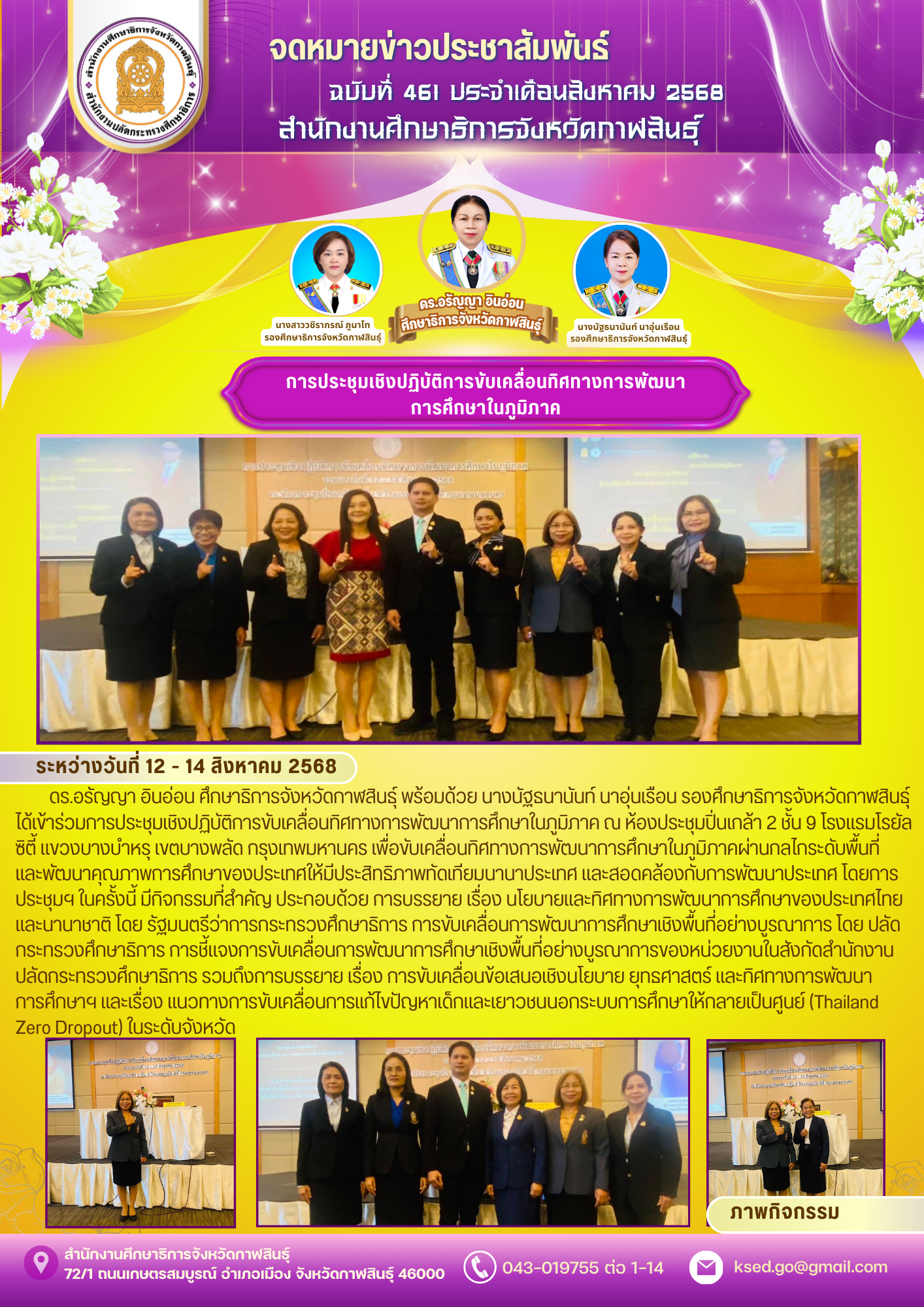 ประชุมเชิงปฏิบัติการแลกเปลี่ยนเรียนรู้การขับเคลื่อนยุทธศาสตร์การพัฒนาการศึกษากลุ่มจังหวัดภาคตะวันออกเฉียงเหนือตอนกลาง (ร้อยแก่นสารสินธุ์)ประจำปีงบประมาณ พ.ศ. 2568โดย : นายสุวิทย์ ปะกาเวสา28 สิงหาคม 2568