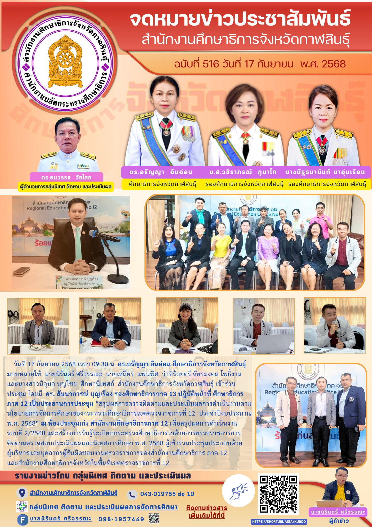 การเข้าร่วมประชุมสรุปผลการตรวจติดตามและประเมินผลการดำเนินงานตามนโยบายการจัดการศึกษาของกระทรวงศึกษาธิการ เขตตรวจราชการที่ 12 ประจำปีงบประมาณ พ.ศ. 2568โดย : นายสุวิทย์ ปะกาเวสา17 กันยายน 2568