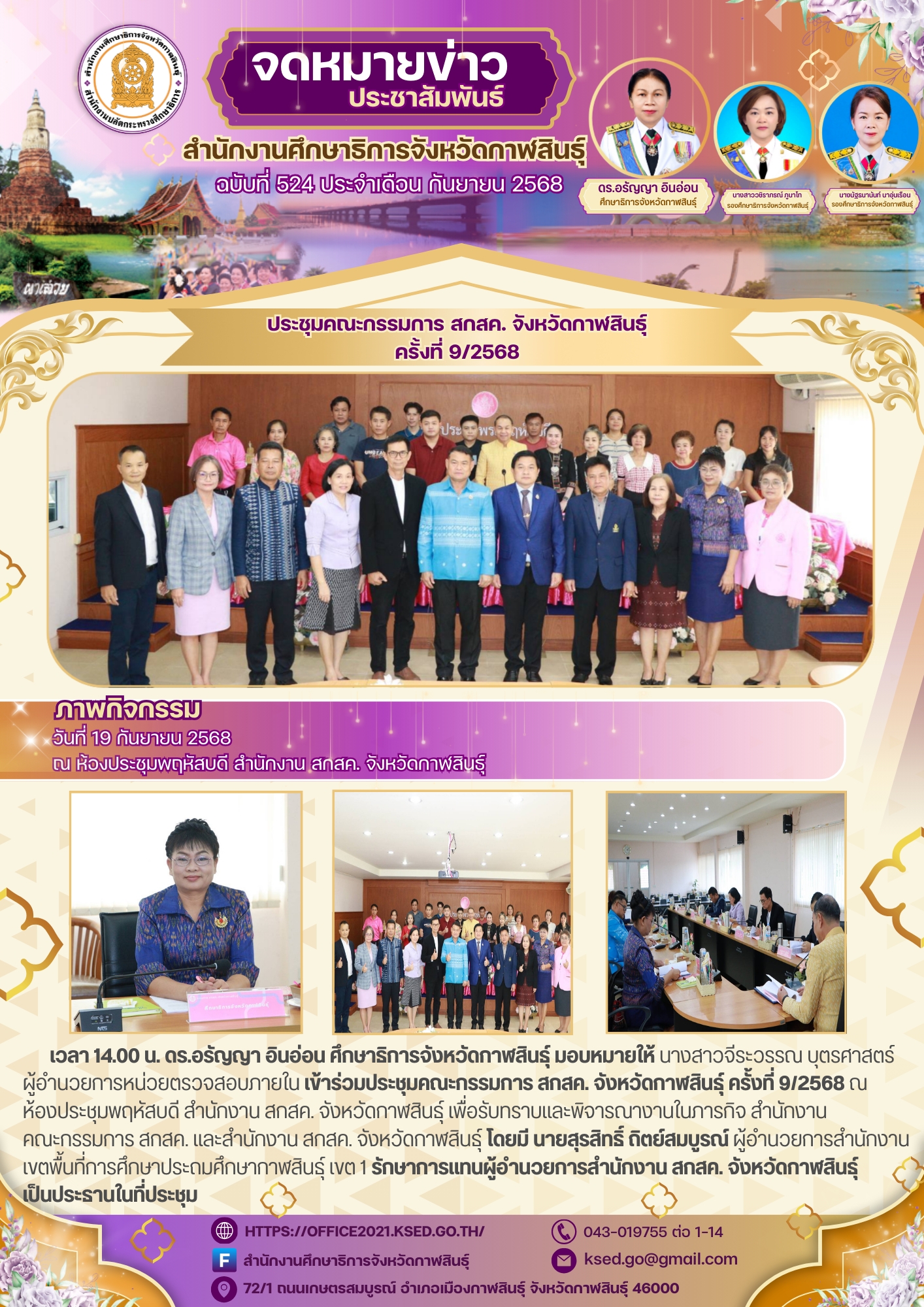ประชุมคณะกรรมการ สกสค. จังหวัดกาฬสินธุ์ ครั้งที่ 9/2568โดย : นายสุวิทย์ ปะกาเวสา19 กันยายน 2568