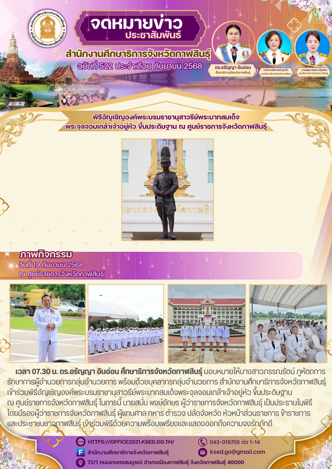 เข้าร่วมพิธีอัญเชิญองค์พระบรมราชานุสาวรีย์พระบาทสมเด็จพระจุลจอมเกล้าเจ้าอยู่หัว ขึ้นประดิษฐาน ณ ศูนย์ราชการจังหวัดกาฬสินธุ์โดย : นายสุวิทย์ ปะกาเวสา19 กันยายน 2568