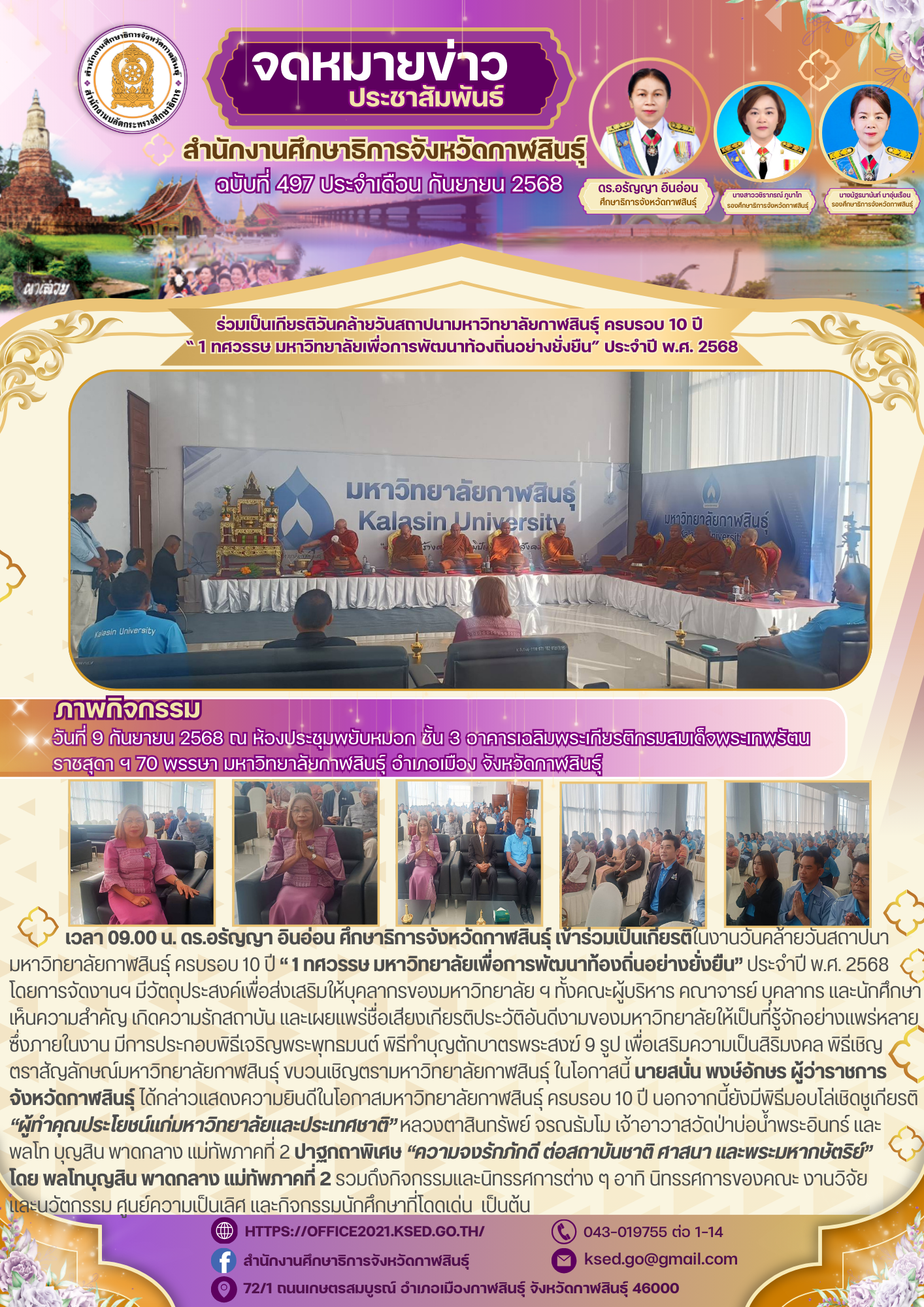 งานวันคล้ายวันสถาปนามหาวิทยาลัยกาฬสินธุ์ ครบรอบ 10 ปีโดย : นายสุวิทย์ ปะกาเวสา9 กันยายน 2568
