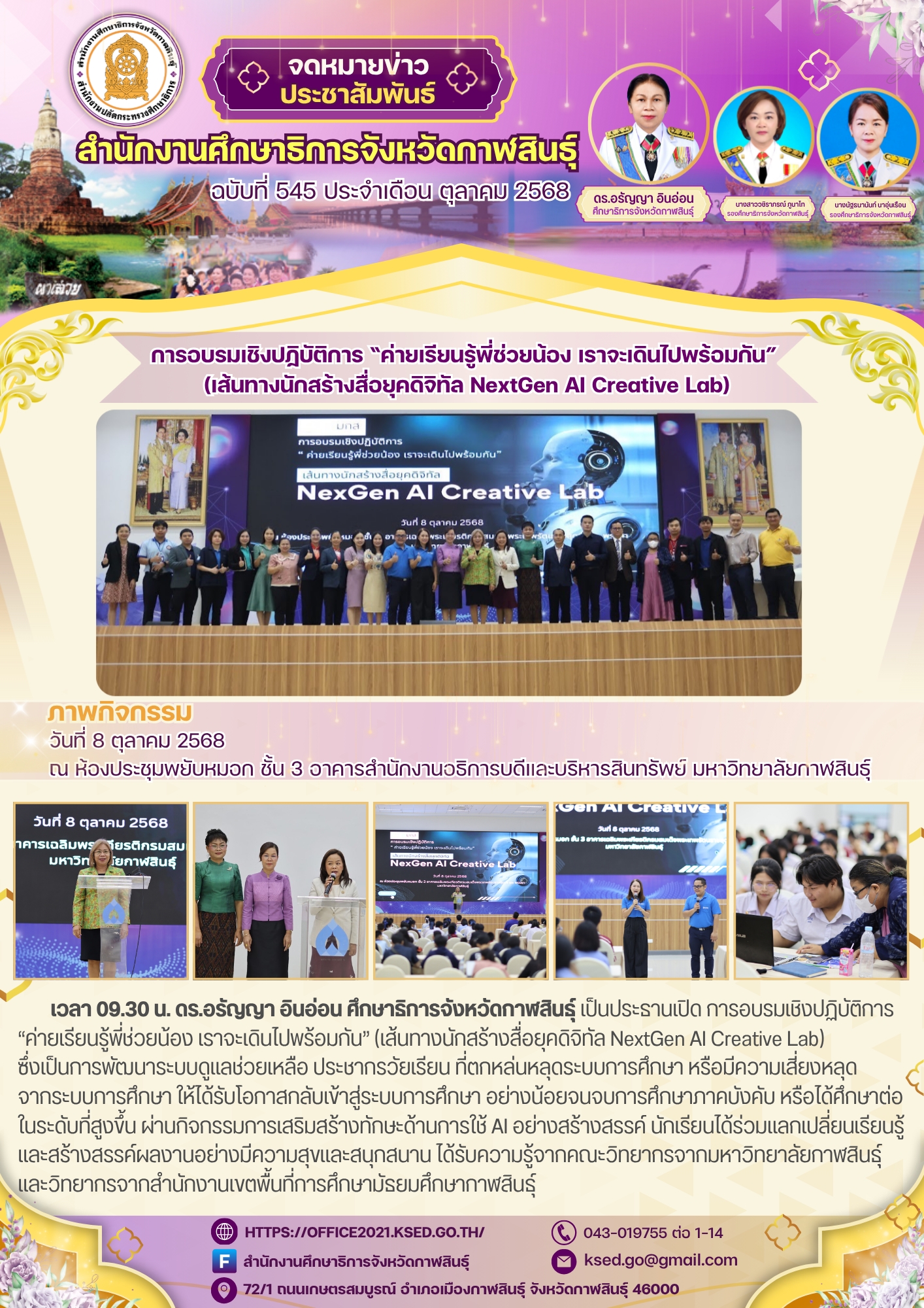 “ค่ายเรียนรู้พี่ช่วยน้อง เราจะเดินไปพร้อมกัน” (เส้นทางนักสร้างสื่อยุคดิจิทัล NextGen AI Creative Lab)โดย : นายสุวิทย์ ปะกาเวสา8 ตุลาคม 2568