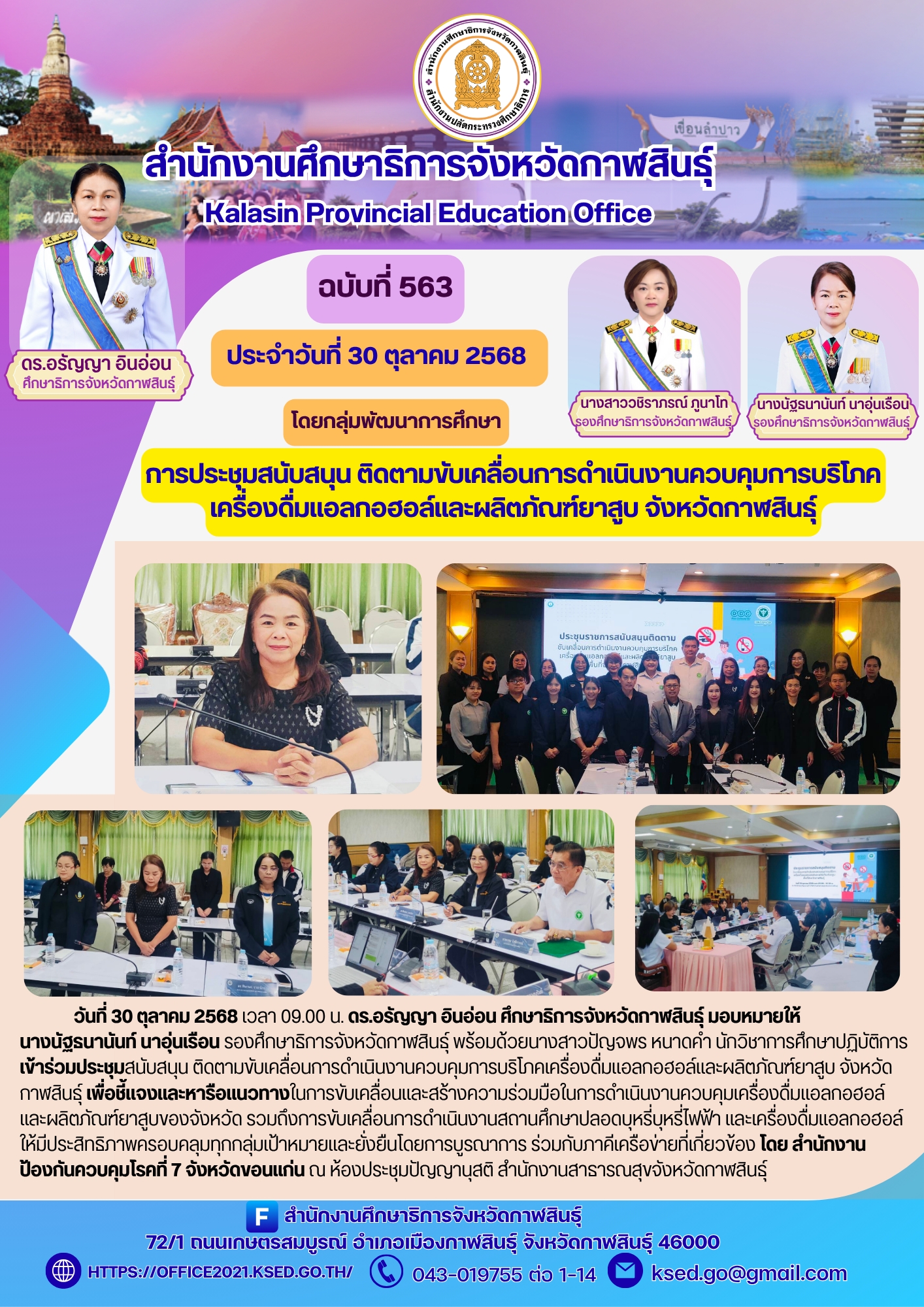 ประชุมสนับสนุน ติดตามขับเคลื่อนการดำเนินงานควบคุมการบริโภคเครื่องดื่มแอลกอฮอล์และผลิตภัณฑ์ยาสูบ จังหวัดกาฬสินธุ์โดย : นายสุวิทย์ ปะกาเวสา30 ตุลาคม 2568