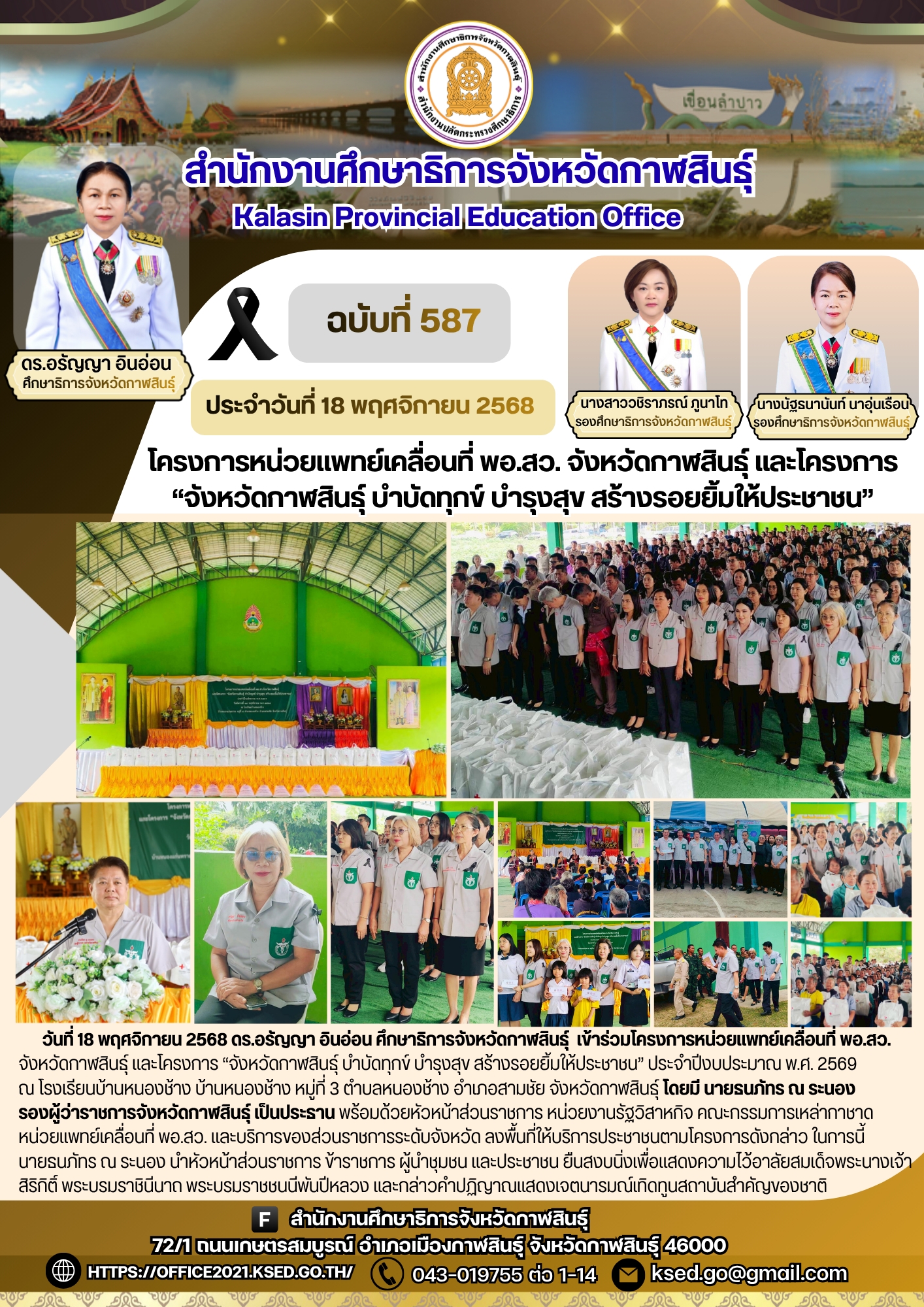 โครงการหน่วยแพทย์เคลื่อนที่ พอ.สว. และ โครงการ “จังหวัดกาฬสินธุ์ บำบัดทุกข์ บำรุงสุข สร้างรอยยิ้มให้ประชาชน” ประจำปีงบประมาณ พ.ศ. 2568 ประจำเดือนกันยายนโดย : นายสุวิทย์ ปะกาเวสา25 กันยายน 2568