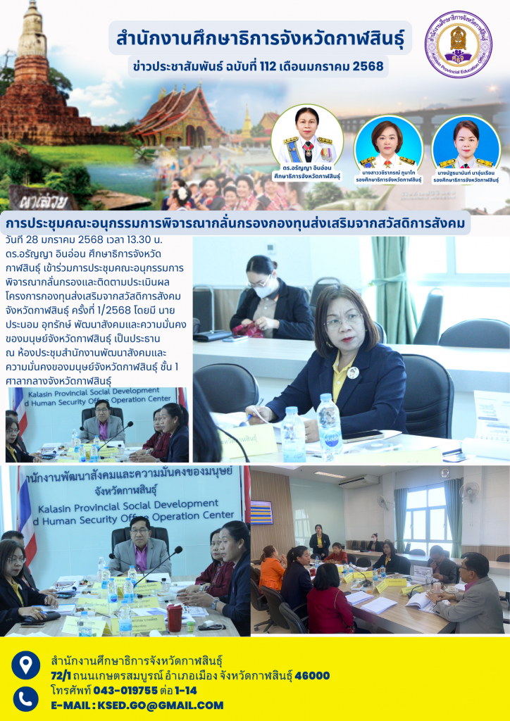 วันที่ 28 มกราคม 2568 เวลา 13.30 น. ดร.อรัญญา อินอ่อน ศึกษาธิการจังหวัดกาฬสินธุ์ เข้าร่วมการประชุมคณะอนุกรรมการพิจารณากลั่นกรองและติดตามประเมินผลโครงการกองทุนส่งเสริมจากสวัสดิการสังคมจังหวัดกาฬสินธุ์ ครั้งที่ 1/2568 โดยมี นายประนอม อุทรักษ์ พัฒนาสังคมและความมั่นคงของมนุษย์จังหวัดกาฬสินธุ์ เป็นประธาน ณ ห้องประชุมสำนักงานพัฒนาสังคมและความมั่นคงของมนุษย์จังหวัดกาฬสินธุ์ ชั้น 1 ศาลากลางจังหวัดกาฬสินธุ์