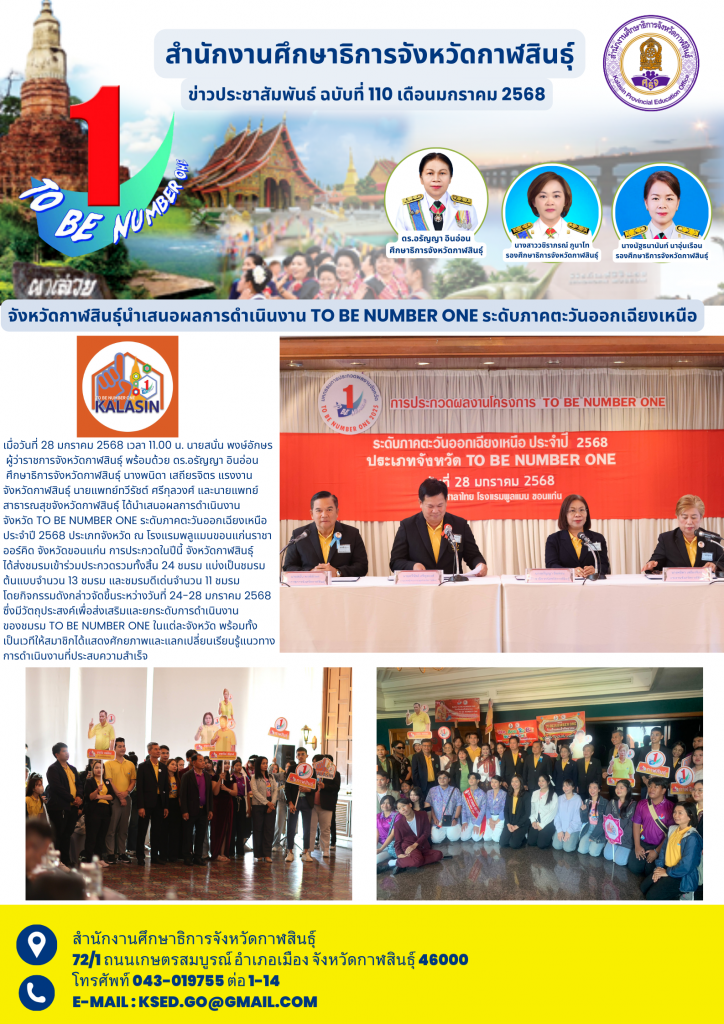 เมื่อวันที่ 28 มกราคม 2568 เวลา 11.00 น. นายสนั่น พงษ์อักษร ผู้ว่าราชการจังหวัดกาฬสินธุ์ พร้อมด้วย ดร.อรัญญา อินอ่อน ศึกษาธิการจังหวัดกาฬสินธุ์ นางพนิดา เสถียรจิตร แรงงานจังหวัดกาฬสินธุ์ นายแพทย์ทวีรัชต์ ศรีกุลวงศ์ และนายแพทย์สาธารณสุขจังหวัดกาฬสินธุ์ ได้นำเสนอผลการดำเนินงานจังหวัด TO BE NUMBER ONE ระดับภาคตะวันออกเฉียงเหนือ ประจำปี 2568 ประเภทจังหวัด ณ โรงแรมพลูแมนขอนแก่นราชาออร์คิด จังหวัดขอนแก่น