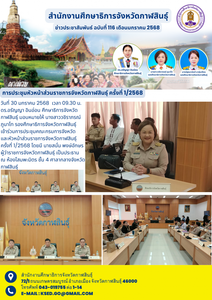 วันที่ 30 มกราคม 2568 เวลา 09.30 น. ดร.อรัญญา อินอ่อน ศึกษาธิการจังหวัดกาฬสินธุ์ มอบหมายให้ นางสาววชิราภรณ์ ภูนาโท รองศึกษาธิการจังหวัดกาฬสินธุ์ เข้าร่วมการประชุมคณะกรมการจังหวัด และหัวหน้าส่วนราชการจังหวัดกาฬสินธุ์ ครั้งที่ 1/2568 โดยมี นายสนั่น พงษ์อักษร ผู้ว่าราชการจังหวัดกาฬสินธุ์ เป็นประธาน ณ ห้องโสมพะมิตร ชั้น 4 ศาลากลางจังหวัดกาฬสินธุ์