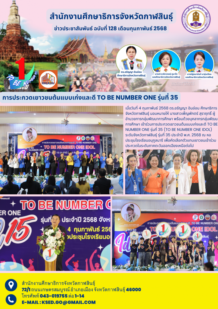 เมื่อวันที่ 4 กุมภาพันธ์ 2568 ดร.อรัญญา อินอ่อน ศึกษาธิการจังหวัดกาฬสินธุ์ มอบหมายให้ นางสาวเพ็ญพักตร์ สุราฤทธิ์ ผู้อำนวยการกลุ่มพัฒนาการศึกษา พร้อมด้วยบุคลากรกลุ่มพัฒนการศึกษา เข้าร่วมการประกวดเยาวชนต้นแบบเก่งและดี TO BE NUMBER ONE รุ่นที่ 35 (TO BE NUMBER ONE IDOL) ระดับจังหวัดกาฬสินธุ์ รุ่นที่ 35 ประจำปี พ.ศ. 2568 ณ หอประชุมโรงเรียนอนุกูลนารี เพื่อคัดเลือกตัวแทนเยาวชนเข้าร่วมประกวดในระดับภาคตะวันออกเฉียงเหนือต่อไป