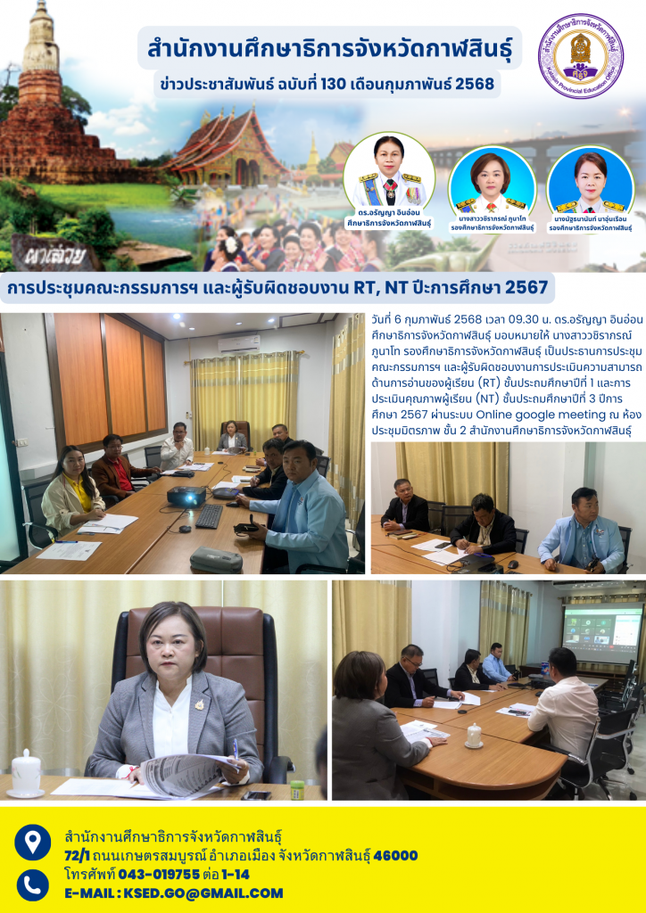 วันที่ 6 กุมภาพันธ์ 2568 เวลา 09.30 น. ดร.อรัญญา อินอ่อน ศึกษาธิการจังหวัดกาฬสินธุ์ มอบหมายให้ นางสาววชิราภรณ์ ภูนาโท รองศึกษาธิการจังหวัดกาฬสินธุ์ เป็นประธานการประชุมคณะกรรมการฯ และผู้รับผิดชอบงานการประเมินความสามารถด้านการอ่านของผู้เรียน (RT) ชั้นประถมศึกษาปีที่ 1 และการประเมินคุณภาพผู้เรียน (NT) ชั้นประถมศึกษาปีที่ 3 ปีการศึกษา 2567 ผ่านระบบ Online google meeting ณ ห้องประชุมมิตรภาพ ชั้น 2 สำนักงานศึกษาธิการจังหวัดกาฬสินธุ์