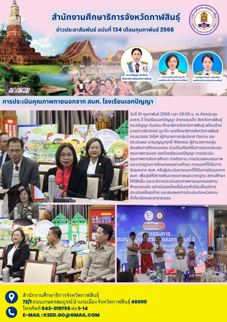 วันที่ 10 กุมภาพันธ์ 2568 เวลา 09:00 น. ณ ห้องประชุมอาคาร 3 โรงเรียนเอกปัญญา อำเภอสมเด็จ จังหวัดกาฬสินธุ์ ดร.อรัญญา อินอ่อน ศึกษาธิการจังหวัดกาฬสินธุ์ พร้อมด้วย นางสาววชิราภรณ์ ภูนาโท รองศึกษาธิการจังหวัดกาฬสินธุ์ ดร.ธนวรรธ วัชโสก ผู้อำนวยการกลุ่มนิเทศ ติดตาม และประเมินผล นายบุญญาฤทธิ์ ศิริพรรณ ผู้อำนวยการกลุ่มส่งเสริมการศึกษาเอกชน ร่วมเป็นเกียรติในการตรวจประเมินคุณภาพภายนอก ของโรงเรียนเอกปัญญา การประเมินคุณภาพการจัดการศึกษา การติดตาม การตรวจสอบคุณภาพ และมาตรฐานการศึกษาของสถานศึกษา ภายนอกที่ได้รับการรับรองจาก สมศ. หรือผู้ประเมินภายนอกที่ได้รับการรับรองจากสมศ. เพื่อมุ่งให้มีการพัฒนาคุณภาพและมาตรฐาน สถานศึกษาให้ดียิ่งขึ้น และจะมีการประเมินคุณภาพภายนอกของสถานศึกษาทุกแห่ง อย่างน้อยหนึ่งครั้งในทุกห้าปีนับตั้งแต่การประเมินครั้งสุดท้าย และเสนอผลการประเมินต่อหน่วยงานที่เกี่ยวข้องและสาธารณชน