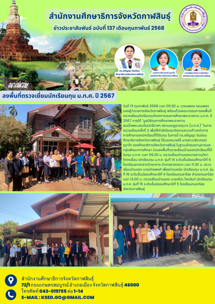 ในการนี้ ดร.อรัญญา อินอ่อน ศึกษาธิการจังหวัดกาฬสินธุ์ ได้มอบหมายให้ นางสาววชิราภรณ์ ภูนาโท รองศึกษาธิการจังหวัดกาฬสินธุ์ ในฐานะฝ่ายเลขานุการและกลุ่มพัฒนาการศึกษา ร่วมลงพื้นที่ตรวจเยี่ยมบ้านของนักเรียนที่ได้รับทุน ม.ท.ศ. ดังนี้