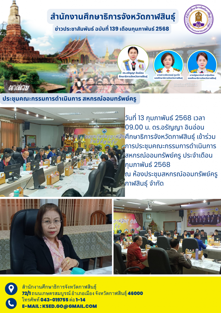 วันที่ 13 กุมภาพันธ์ 2568 เวลา 09.00 น. ดร.อรัญญา อินอ่อน ศึกษาธิการจังหวัดกาฬสินธุ์ เข้าร่วมการประชุมคณะกรรมการดำเนินการ สหกรณ์ออมทรัพย์ครู ประจำเดือน กุมภาพันธ์ 2568