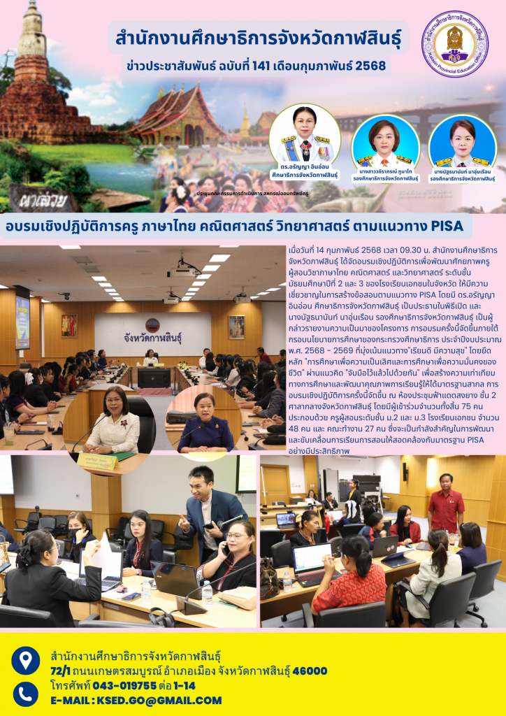 เมื่อวันที่ 14 กุมภาพันธ์ 2568 เวลา 09.30 น. สำนักงานศึกษาธิการจังหวัดกาฬสินธุ์ ได้จัดอบรมเชิงปฏิบัติการเพื่อพัฒนาศักยภาพครูผู้สอนวิชาภาษาไทย คณิตศาสตร์ และวิทยาศาสตร์ ระดับชั้นมัธยมศึกษาปีที่ 2 และ 3 ของโรงเรียนเอกชนในจังหวัด ให้มีความเชี่ยวชาญในการสร้างข้อสอบตามแนวทาง PISA โดยมี ดร.อรัญญา อินอ่อน ศึกษาธิการจังหวัดกาฬสินธุ์ เป็นประธานในพิธีเปิด และ นางนัฐธนานันท์ นาอุ่นเรือน รองศึกษาธิการจังหวัดกาฬสินธุ์ เป็นผู้กล่าวรายงานความเป็นมาของโครงการ