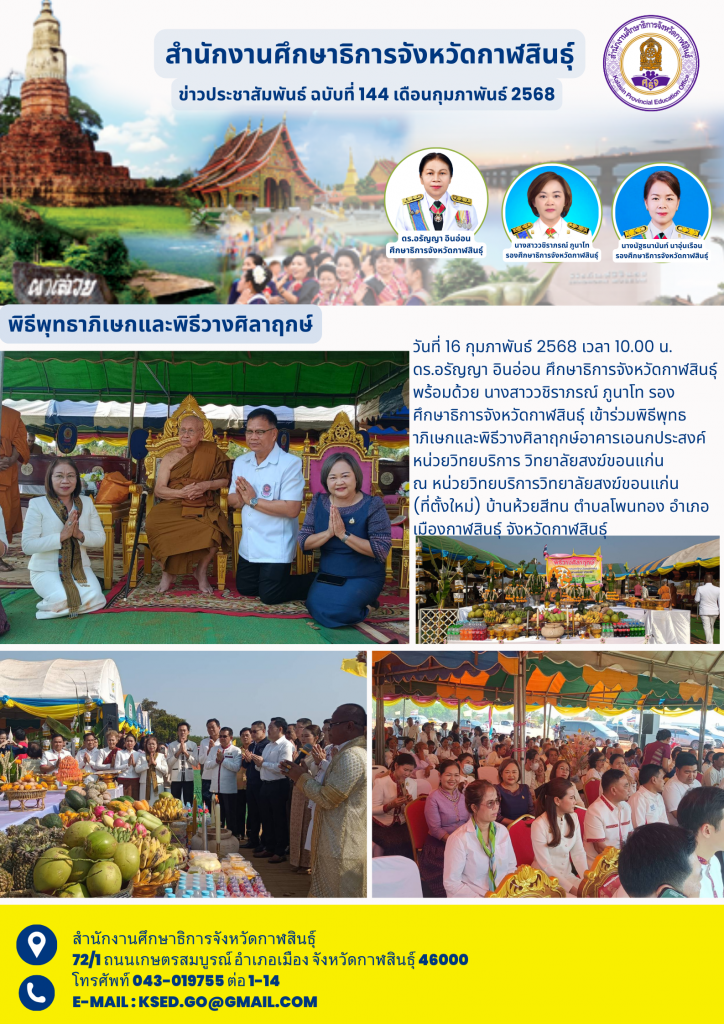 วันที่ 16 กุมภาพันธ์ 2568 เวลา 10.00 น. ดร.อรัญญา อินอ่อน ศึกษาธิการจังหวัดกาฬสินธุ์ พร้อมด้วย นางสาววชิราภรณ์ ภูนาโท รองศึกษาธิการจังหวัดกาฬสินธุ์ เข้าร่วมพิธีพุทธาภิเษกและพิธีวางศิลาฤกษ์อาคารเอนกประสงค์หน่วยวิทยบริการ วิทยาลัยสงฆ์ขอนแก่น ณ หน่วยวิทยบริการวิทยาลัยสงฆ์ขอนแก่น (ที่ตั้งใหม่) บ้านห้วยสีทน ตำบลโพนทอง อำเภอเมืองกาฬสินธุ์ จังหวัดกาฬสินธุ์