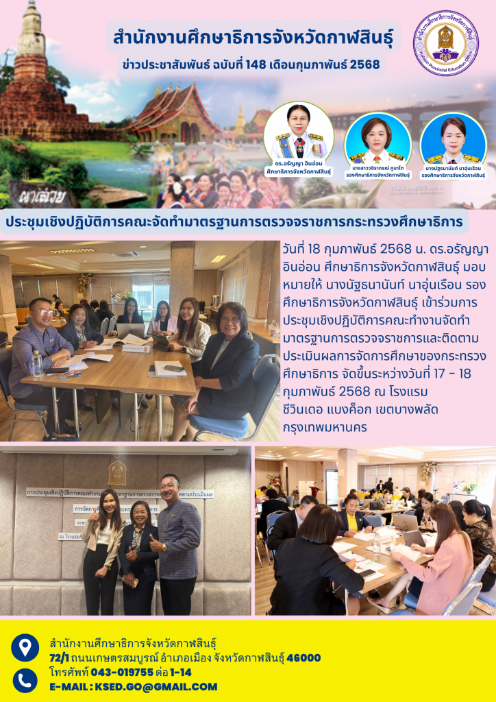 วันที่ 18 กุมภาพันธ์ 2568 น. ดร.อรัญญา อินอ่อน ศึกษาธิการจังหวัดกาฬสินธุ์ มอบหมายให้ นางนัฐธนานันท์ นาอุ่นเรือน รองศึกษาธิการจังหวัดกาฬสินธุ์ เข้าร่วมการประชุมเชิงปฏิบัติการคณะทำงานจัดทำมาตรฐานการตรวจจราชการและติดตามประเมินผลการจัดการศึกษาของกระทรวงศึกษาธิการ จัดขึ้นระหว่างวันที่ 17 – 18 กุมภาพันธ์ 2568 ณ โรงแรมชีวิน เดอ แบงค็อก เขตบางพลัด กรุงเทพมหานคร