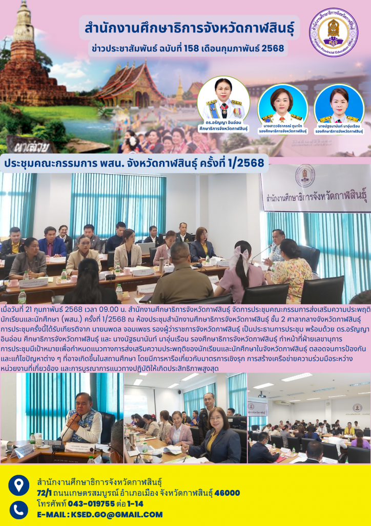 เมื่อวันที่ 21 กุมภาพันธ์ 2568 เวลา 09.00 น. สำนักงานศึกษาธิการจังหวัดกาฬสินธุ์ จัดการประชุมคณะกรรมการส่งเสริมความประพฤตินักเรียนและนักศึกษา (พสน.) ครั้งที่ 1/2568 ณ ห้องประชุมสำนักงานศึกษาธิการจังหวัดกาฬสินธุ์ ชั้น 2 ศาลากลางจังหวัดกาฬสินธุ์