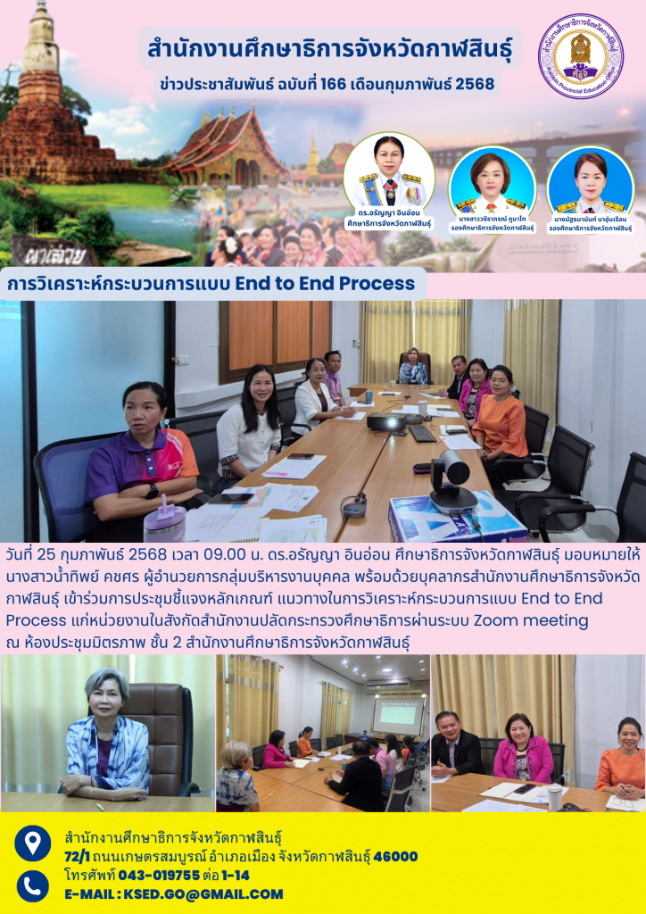 วันที่ 25 กุมภาพันธ์ 2568 เวลา 09.00 น. ดร.อรัญญา อินอ่อน ศึกษาธิการจังหวัดกาฬสินธุ์ มอบหมายให้ นางสาวน้ำทิพย์ คชศร ผู้อำนวยการกลุ่มบริหารงานบุคคล พร้อมด้วยบุคลากรสำนักงานศึกษาธิการจังหวัดกาฬสินธุ์ เข้าร่วมการประชุมชี้แจงหลักเกณฑ์ แนวทางในการวิเคราะห์กระบวนการแบบ End to End Process แก่หน่วยงานในสังกัดสำนักงานปลัดกระทรวงศึกษาธิการผ่านระบบ Zoom meeting ณ ห้องประชุมมิตรภาพ ชั้น 2 สำนักงานศึกษาธิการจังหวัดกาฬสินธุ์