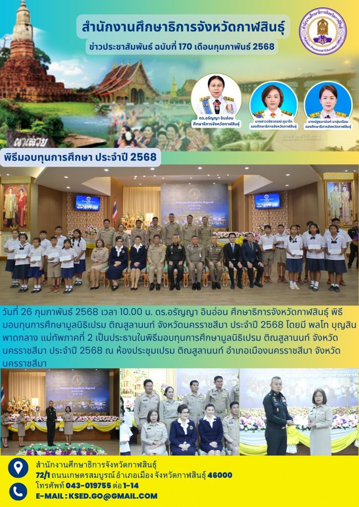 วันที่ 26 กุมภาพันธ์ 2568 เวลา 10.00 น. ดร.อรัญญา อินอ่อน ศึกษาธิการจังหวัดกาฬสินธุ์ พิธีมอบทุนการศึกษามูลนิธิเปรม ติณสูลานนท์ จังหวัดนครราชสีมา ประจำปี 2568 โดยมี พลโท บุญสิน พาดกลาง แม่ทัพภาคที่ 2 เป็นประธานในพิธีมอบทุนการศึกษามูลนิธิเปรม ติณสูลานนท์ จังหวัดนครราชสีมา ประจำปี 2568 ณ ห้องประชุมเปรม ติณสูลานนท์ อำเภอเมืองนครราชสีมา จังหวัดนครราชสีมา