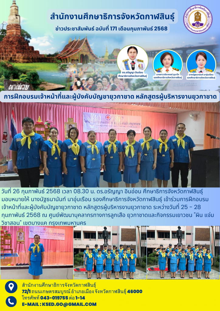 วันที่ 26 กุมภาพันธ์ 2568 เวลา 08.30 น. ดร.อรัญญา อินอ่อน ศึกษาธิการจังหวัดกาฬสินธุ์ มอบหมายให้ นางนัฐธนานันท์ นาอุ่นเรือน รองศึกษาธิการจังหวัดกาฬสินธุ์ เข้าร่วมการฝึกอบรมเจ้าหน้าที่และผู้บังคับบัญชายุวกาชาด หลักสูตรผู้บริหารงานยุวกาชาด ระหว่างวันที่ 25 – 28 กุมภาพันธ์ 2568 ณ ศูนย์พัฒนาบุคลากรทางการลูกเสือ ยุวกาชาดและกิจกรรมเยาวชน “ผิน แจ่มวิชาสอน” เขตบางแค กรุงเทพมหานคร