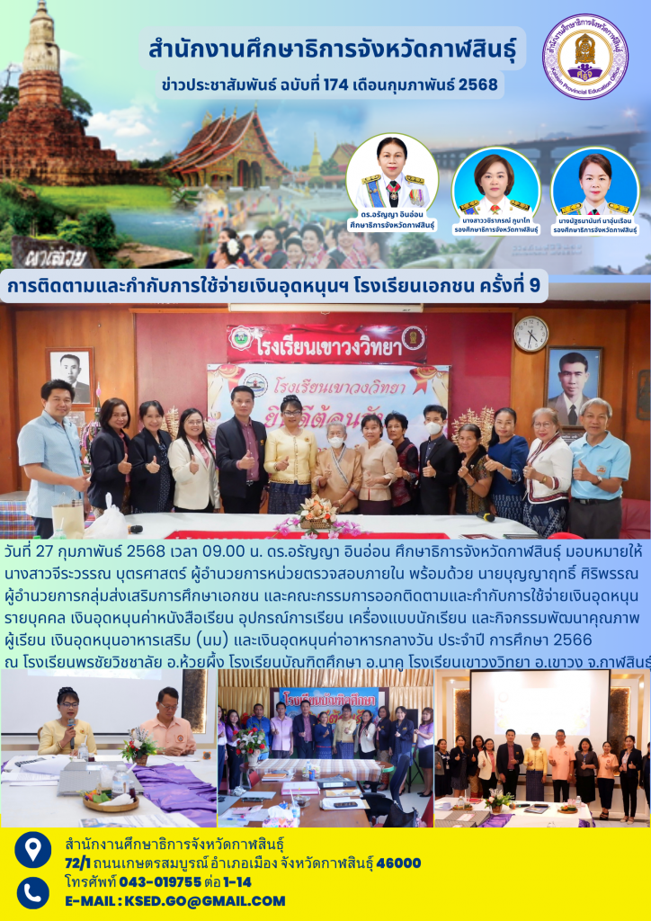 วันที่ 27 กุมภาพันธ์ 2568 เวลา 09.00 น. ดร.อรัญญา อินอ่อน ศึกษาธิการจังหวัดกาฬสินธุ์ มอบหมายให้ นางสาวจีระวรรณ บุตรศาสตร์ ผู้อำนวยการหน่วยตรวจสอบภายใน พร้อมด้วย นายบุญญาฤทธิ์ ศิริพรรณ ผู้อำนวยการกลุ่มส่งเสริมการศึกษาเอกชน และคณะกรรมการออกติดตามและกำกับการใช้จ่ายเงินอุดหนุนรายบุคคล เงินอุดหนุนค่าหนังสือเรียน อุปกรณ์การเรียน เครื่องแบบนักเรียน และกิจกรรมพัฒนาคุณภาพผู้เรียน เงินอุดหนุนอาหารเสริม (นม) และเงินอุดหนุนค่าอาหารกลางวัน ประจำปี การศึกษา 2566 ณ โรงเรียนพรชัยวิชชาลัย อ.ห้วยผึ้ง โรงเรียนบัณฑิตศึกษา อ.นาคู และโรงเรียนเขาวงวิทยา อ.เขาวง จ.กาฬสินธุ์