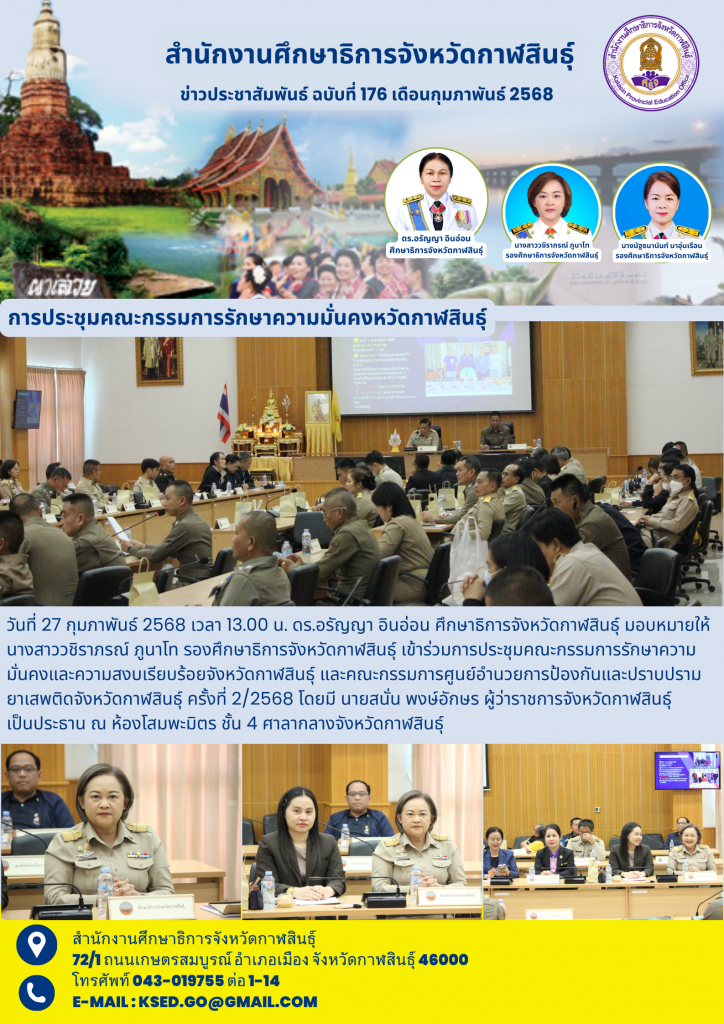 วันที่ 27 กุมภาพันธ์ 2568 เวลา 13.00 น. ดร.อรัญญา อินอ่อน ศึกษาธิการจังหวัดกาฬสินธุ์ มอบหมายให้ นางสาววชิราภรณ์ ภูนาโท รองศึกษาธิการจังหวัดกาฬสินธุ์ เข้าร่วมการประชุมคณะกรรมการรักษาความมั่นคงและความสงบเรียบร้อยจังหวัดกาฬสินธุ์ และคณะกรรมการศูนย์อำนวยการป้องกันและปราบปรามยาเสพติดจังหวัดกาฬสินธุ์ ครั้งที่ 2/2568 โดยมี นายสนั่น พงษ์อักษร ผู้ว่าราชการจังหวัดกาฬสินธุ์ เป็นประธาน ณ ห้องโสมพะมิตร ชั้น 4 ศาลากลางจังหวัดกาฬสินธุ์