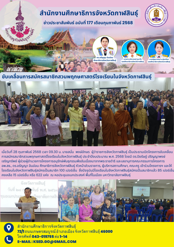 เมื่อวันที่ 28 กุมภาพันธ์ 2568 เวลา 09.30 น. นายสนั่น พงษ์อักษร ผู้ว่าราชการจังหวัดกาฬสินธุ์ เป็นประธานเปิดโครงการขับเคลื่อนการสมัครสมาชิกสวนพฤกษศาสตร์โรงเรียนในจังหวัดกาฬสินธุ์ ประจำปีงบประมาณ พ.ศ. 2568 โดยมี ดร.ปิยรัษฎ์ ปริญญาพงษ์ เจริญทรัพย์ ผู้ช่วยผู้อำนวยการโครงการอนุรักษ์พันธุกรรมพืชอันเนื่องมาจากพระราชดำริ และเลขานุการคณะกรรมการโครงการ อพ.สธ., ดร.อรัญญา อินอ่อน ศึกษาธิการจังหวัดกาฬสินธุ์ หัวหน้าส่วนราชการ, ผู้บริหารสถานศึกษา, คณะครู เข้าร่วมโครงการฯ และให้โรงเรียนในจังหวัดกาฬสินธุ์สมัครเป็นสมาชิก 100 เปอร์เซ็น ซึ่งปัจจุบันมีโรงเรียนในจังหวัดกาฬสินธุ์สมัครเป็นสมาชิกแล้ว 85 เปอร์เซ็น คงเหลือ 15 เปอร์เซ็น หรือ 622 แห่ง ณ หอประชุมอเนกประสงค์ พื้นที่ในเมือง มหาวิทยาลัยกาฬสินธุ์