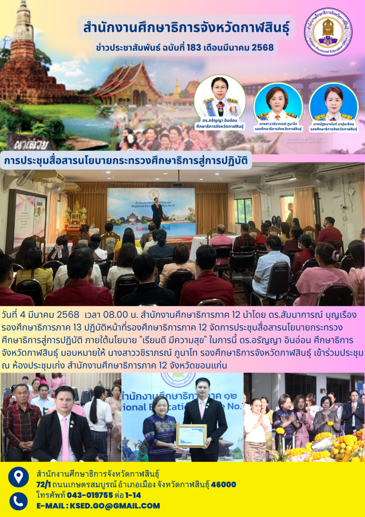 วันที่ 4 มีนาคม 2568 เวลา 08.00 น. สำนักงานศึกษาธิการภาค 12 นำโดย ดร.สัมนาการณ์ บุญเรือง รองศึกษาธิการภาค 13 ปฏิบัติหน้าที่รองศึกษาธิการภาค 12 จัดการประชุมสื่อสารนโยบายกระทรวงศึกษาธิการสู่การปฏิบัติ ภายใต้นโยบาย “เรียนดี มีความสุข” ในการนี้ ดร.อรัญญา อินอ่อน ศึกษาธิการจังหวัดกาฬสินธุ์ มอบหมายให้ นางสาววชิราภรณ์ ภูนาโท รองศึกษาธิการจังหวัดกาฬสินธุ์ เข้าร่วมประชุม ณ ห้องประชุมเก่ง สำนักงานศึกษาธิการภาค 12 จังหวัดขอนแก่น