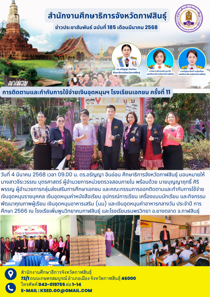 วันที่ 4 มีนาคม 2568 เวลา 09.00 น. ดร.อรัญญา อินอ่อน ศึกษาธิการจังหวัดกาฬสินธุ์ มอบหมายให้ นางสาวจีระวรรณ บุตรศาสตร์ ผู้อำนวยการหน่วยตรวจสอบภายใน พร้อมด้วย นายบุญญาฤทธิ์ ศิริพรรญ ผู้อำนวยการกลุ่มส่งเสริมการศึกษาเอกชน และคณะกรรมการออกติดตามและกำกับการใช้จ่ายเงินอุดหนุนรายบุคคล เงินอุดหนุนค่าหนังสือเรียน อุปกรณ์การเรียน เครื่องแบบนักเรียน และกิจกรรมพัฒนาคุณภาพผู้เรียน เงินอุดหนุนอาหารเสริม (นม) และเงินอุดหนุนค่าอาหารกลางวัน ประจำปี การศึกษา 2566 ณ โรงเรียเพิ่มพูนวิทยาคมกาฬสินธุ์ และโรงเรียนธนพรวิทยา อ.ยางตลาด จ.กาฬสินธุ์