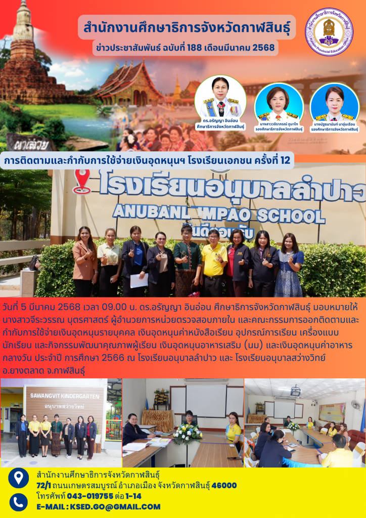 วันที่ 5 มีนาคม 2568 เวลา 09.00 น. ดร.อรัญญา อินอ่อน ศึกษาธิการจังหวัดกาฬสินธุ์ มอบหมายให้ นางสาวจีระวรรณ บุตรศาสตร์ ผู้อำนวยการหน่วยตรวจสอบภายใน และคณะกรรมการออกติดตามและกำกับการใช้จ่ายเงินอุดหนุนรายบุคคล เงินอุดหนุนค่าหนังสือเรียน อุปกรณ์การเรียน เครื่องแบบนักเรียน และกิจกรรมพัฒนาคุณภาพผู้เรียน เงินอุดหนุนอาหารเสริม (นม) และเงินอุดหนุนค่าอาหารกลางวัน ประจำปี การศึกษา 2566 ณ โรงเรียนอนุบาลลำปาว และ โรงเรียนอนุบาลสว่างวิทย์ อ.ยางตลาด จ.กาฬสินธุ์