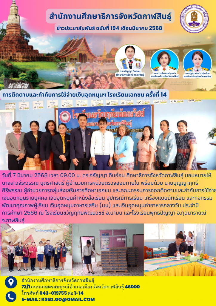 วันที่ 7 มีนาคม 2568 เวลา 09.00 น. ดร.อรัญญา อินอ่อน ศึกษาธิการจังหวัดกาฬสินธุ์ มอบหมายให้ นางสาวจีระวรรณ บุตรศาสตร์ ผู้อำนวยการหน่วยตรวจสอบภายใน พร้อมด้วย นายบุญญาฤทธิ์ ศิริพรรณ ผู้อำนวยการกลุ่มส่งเสริมการศึกษาเอกชน และคณะกรรมการออกติดตามและกำกับการใช้จ่ายเงินอุดหนุนรายบุคคล เงินอุดหนุนค่าหนังสือเรียน อุปกรณ์การเรียน เครื่องแบบนักเรียน และกิจกรรมพัฒนาคุณภาพผู้เรียน เงินอุดหนุนอาหารเสริม (นม) และเงินอุดหนุนค่าอาหารกลางวัน ประจำปี การศึกษา 2566 ณ โรงเรียนขวัญฤทัยพัฒนวิชช์ อ.นามน และโรงเรียนพุทธปัญญา อ.กุฉินารายณ์ จ.กาฬสินธุ์