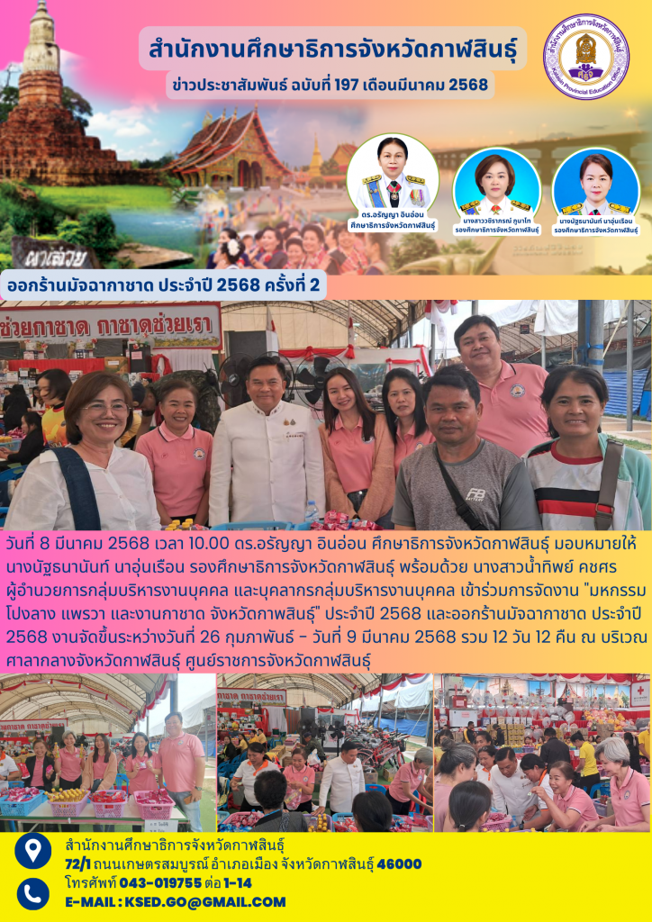 วันที่ 8 มีนาคม 2568 เวลา 10.00 ดร.อรัญญา อินอ่อน ศึกษาธิการจังหวัดกาฬสินธุ์ มอบหมายให้ นางนัฐธนานันท์ นาอุ่นเรือน รองศึกษาธิการจังหวัดกาฬสินธุ์ พร้อมด้วย นางสาวน้ำทิพย์ คชศร ผู้อำนวยการกลุ่มบริหารงานบุคคล และบุคลากรกลุ่มบริหารงานบุคคล เข้าร่วมการจัดงาน “มหกรรมโปงลาง แพรวา และงานกาชาด จังหวัดกาพสินธุ์” ประจำปี 2568 และออกร้านมัจฉากาชาด ประจำปี 2568 งานจัดขึ้นระหว่างวันที่ 26 กุมภาพันธ์ – วันที่ 9 มีนาคม 2568 รวม 12 วัน 12 คืน ณ บริเวณศาลากลางจังหวัดกาฬสินธุ์ ศูนย์ราชการจังหวัดกาฬสินธุ์