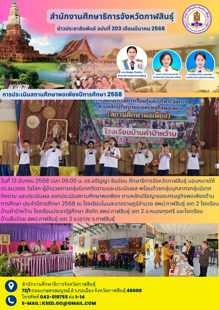 วันที่ 13 มีนาคม 2568 เวลา 09.00 น. ดร.อรัญญา อินอ่อน ศึกษาธิการจังหวัดกาฬสินธุ์ มอบหมายให้ ดร.ธนวรรธ วัชโสก ผู้อำนวยการกลุ่มนิเทศติดตามและประเมินผล พร้อมด้วยกลุ่มบุคลากรกลุ่มนิเทศ ติดตาม และประเมินผล ออกประเมินสถานศึกษาพอเพียง ตามหลักปรัชญาของเศรษฐกิจพอเพียงด้านการศึกษา ประจำปีการศึกษา 2568 ณ โรงเรียนโนนสะอาดราษฎร์อำนวย สพป.กาฬสินธุ์ เขต 2 โรงเรียนบ้านคำป่าหว้าน โรงเรียนประชารัฐศึกษา สังกัด สพป.กาฬสินธุ์ เขต 2 อ.หนองกุงศรี และโรงเรียนบ้านส้มป่อย สพป.กาฬสินธุ์ เขต 3 อ.เขาวง จ.กาฬสินธุ์