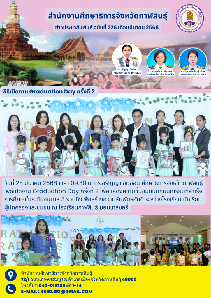 วันที่ 28 มีนาคม 2568 เวลา 09.30 น. ดร.อรัญญา อินอ่อน ศึกษาธิการจังหวัดกาฬสินธุ์ พิธีเปิดงาน Graduation Day ครั้งที่ 2 เพื่อแสดงความชื่นชมยินดีกับนักเรียนที่สำเร็จการศึกษาในระดับอนุบาล 3 รวมถึงเพื่อสร้างความสัมพันธ์อันดี ระหว่างโรงเรียน นักเรียน ผู้ปกครองและชุมชน ณ โรงเรียนกาฬสินธุ์ มอนเทสซอรี่