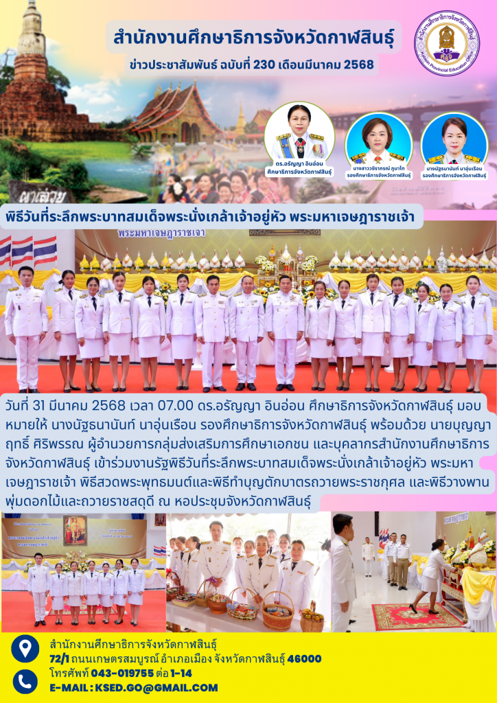 วันที่ 31 มีนาคม 2568 เวลา 07.00 ดร.อรัญญา อินอ่อน ศึกษาธิการจังหวัดกาฬสินธุ์ มอบหมายให้ นางนัฐธนานันท์ นาอุ่นเรือน รองศึกษาธิการจังหวัดกาฬสินธุ์ พร้อมด้วย นายบุญญาฤทธิ์ ศิริพรรณ ผู้อำนวยการกลุ่มส่งเสริมการศึกษาเอกชน และบุคลากรสำนักงานศึกษาธิการจังหวัดกาฬสินธุ์ เข้าร่วมงานรัฐพิธีวันที่ระลึกพระบาทสมเด็จพระนั่งเกล้าเจ้าอยู่หัว พระมหาเจษฎาราชเจ้า พิธีสวดพระพุทธมนต์และพิธีทำบุญตักบาตรถวายพระราชกุศล และพิธีวางพานพุ่มดอกไม้และถวายราชสดุดี ณ หอประชุมจังหวัดกาฬสินธุ์