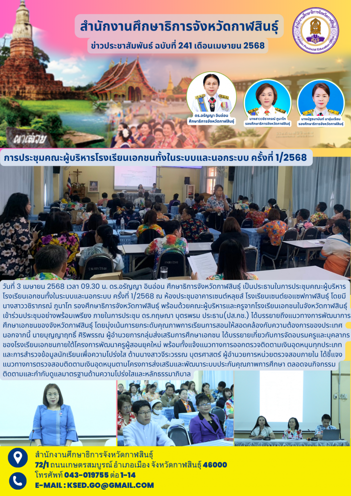 วันที่ 3 เมษายน 2568 เวลา 09.30 น. ดร.อรัญญา อินอ่อน ศึกษาธิการจังหวัดกาฬสินธุ์ เป็นประธานในการประชุมคณะผู้บริหารโรงเรียนเอกชนทั้งในระบบและนอกระบบ ครั้งที่ 1/2568 ณ ห้องประชุมอาคารเซนต์หลุยส์ โรงเรียนเซนต์ยอแซฟกาฬสินธุ์ โดยมีนางสาววชิราภรณ์ ภูนาโท รองศึกษาธิการจังหวัดกาฬสินธุ์ พร้อมด้วยคณะผู้บริหารและครูจากโรงเรียนเอกชนในจังหวัดกาฬสินธุ์เข้าร่วมประชุมอย่างพร้อมเพรียง