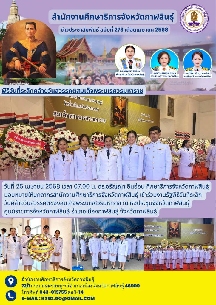 วันที่ 25 เมษายน 2568 เวลา 07.00 น. ดร.อรัญญา อินอ่อน ศึกษาธิการจังหวัดกาฬสินธุ์ มอบหมายให้บุคลากรสำนักงานศึกษาธิการจังหวัดกาฬสินธุ์ เข้าร่วมงานรัฐพิธีวันที่ระลึก วันคล้ายวันสวรรคตของสมเด็จพระนเรศวรมหาราช ณ หอประชุมจังหวัดกาฬสินธุ์ศูนย์ราชการจังหวัดกาฬสินธุ์ อำเภอเมืองกาฬสินธุ์ จังหวัดกาฬสินธุ์