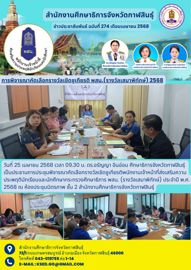 วันที่ 25 เมษายน 2568 เวลา 09.30 น. ดร.อรัญญา อินอ่อน ศึกษาธิการจังหวัดกาฬสินธุ์ เป็นประธานการประชุมพิจารณาคัดเลือกรางวัลเชิดชูเกียรติพนักงานเจ้าหน้าที่ส่งเสริมความประพฤตินักเรียนและนักศึกษากระทรวงศึกษาธิการ พสน. (รางวัลเสมาพิทักษ์) ประจำปี พ.ศ. 2568 ณ ห้องประชุมมิตรภาพ ชั้น 2 สำนักงานศึกษาธิการจังหวัดกาฬสินธุ์