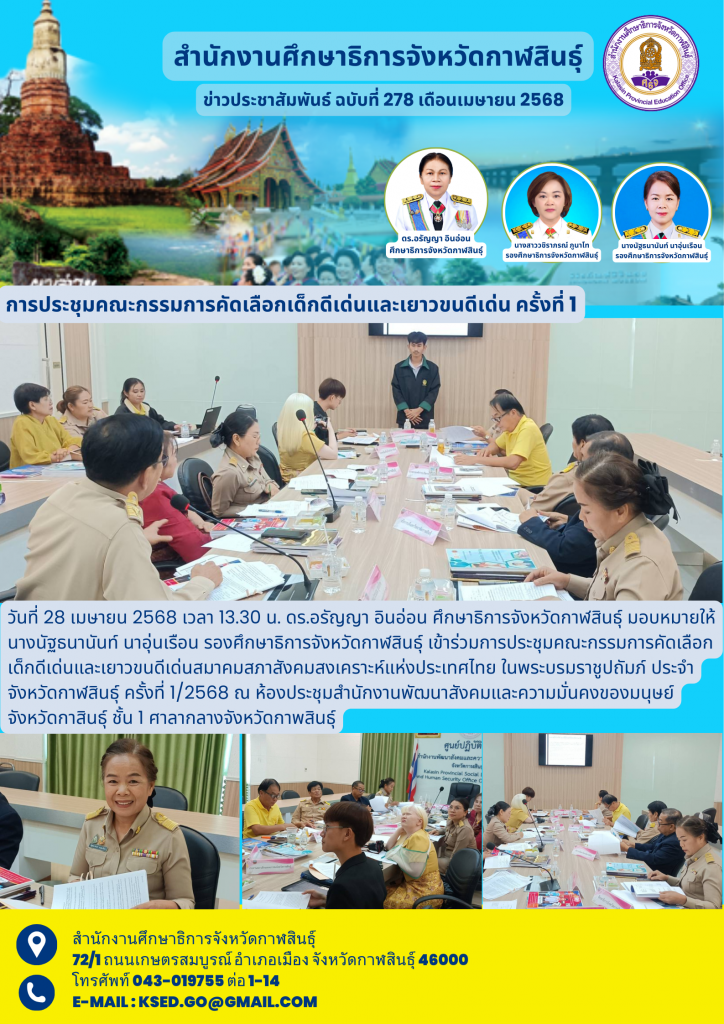 วันที่ 28 เมษายน 2568 เวลา 13.30 น. ดร.อรัญญา อินอ่อน ศึกษาธิการจังหวัดกาฬสินธุ์ มอบหมายให้ นางนัฐธนานันท์ นาอุ่นเรือน รองศึกษาธิการจังหวัดกาฬสินธุ์ เข้าร่วมการประชุมคณะกรรมการคัดเลือกเด็กดีเด่นและเยาวชนดีเด่นสมาคมสภาสังคมสงเคราะห์แห่งประเทศไทย ในพระบรมราชูปถัมภ์ ประจำจังหวัดกาฬสินธุ์ ครั้งที่ 1/2568 ณ ห้องประชุมสำนักงานพัฒนาสังคมและความมั่นคงของมนุษย์จังหวัดกาสินธุ์ ชั้น 1 ศาลากลางจังหวัดกาพสินธุ์