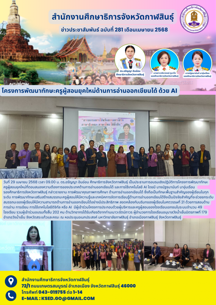 วันที่ 29 เมษายน 2568 เวลา 09.00 น. ดร.อรัญญา อินอ่อน ศึกษาธิการจังหวัดกาฬสินธุ์ เป็นประธานการอบรมเชิงปฏิบัติการโครงการพัฒนาทักษะครูผู้สอนยุคใหม่ที่ตอบสนองความต้องการของประเทศด้านการอ่านออกเขียนได้ และการใช้เทคโนโลยี AI โดยมี นางนัฐธนานันท์ นาอุ่นเรือน รองศึกษาธิการจังหวัดกาฬสินธุ์ กล่าวรายงาน การพัฒนาคุณภาพการศึกษา ด้านการอ่านออกเขียนได้ ซึ่งถือเป็นทักษะพื้นฐานสำคัญของผู้เรียนในทุกระดับ การพัฒนาทักษะเสริมสร้างสมรรถนะครูผู้สอนให้มีความรู้และเทคนิคการจัดการเรียนรู้ด้านการอ่านออกเขียนได้จึงเป็นปัจจัยสำคัญที่จะช่วยยกระดับสมรรถนะของผู้เรียนให้มีความสามารถด้านการอ่านออกเขียนได้อย่างมีประสิทธิภาพ สอดคล้องกับบริบทของผู้เรียนในศตวรรษที่ 21 ด้วยการสอนด้านการอ่าน การเขียน การใช้เทคโนโลยีดิจิทัล หรือ AI มีผู้เข้าร่วมโครงการประกอบด้วยผู้บริหารและครูผู้สอนของโรงเรียนเอกชนในระบบจำนวน 49 โรงเรียน รวมผู้เข้าร่วมอบรมทั้งสิ้น 202 คน ด้านวิทยากรได้รับเกียรติจากท่านเนาวะรัตน์ถาวร ผู้อำนวยการโรงเรียนอนุบาลวังน้ำเย็นมิตรภาพที่ 179 อำเภอวังน้ำเย็น จังหวัดสระแก้วและคณะ ณ หอประชุมอเนกประสงค์ มหาวิทยาลัยกาฬสินธุ์ อำเภอเมืองกาฬสินธุ์ จังหวัดกาฬสินธุ์