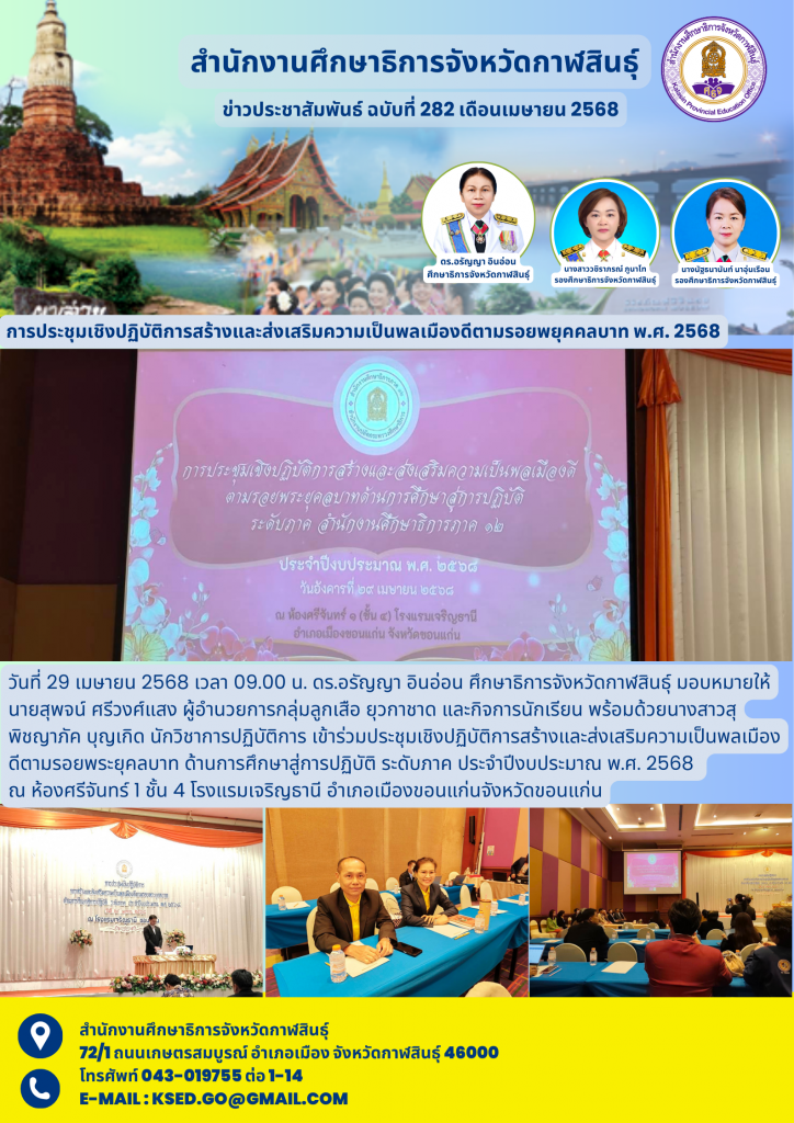 วันที่ 29 เมษายน 2568 เวลา 09.00 น. ดร.อรัญญา อินอ่อน ศึกษาธิการจังหวัดกาฬสินธุ์ มอบหมายให้ นายสุพจน์ ศรีวงศ์แสง ผู้อำนวยการกลุ่มลูกเสือ ยุวกาชาด และกิจการนักเรียน พร้อมด้วยนางสาวสุพิชญาภัค บุญเกิด นักวิชาการปฏิบัติการ เข้าร่วมประชุมเชิงปฏิบัติการสร้างและส่งเสริมความเป็นพลเมืองดีตามรอยพระยุคลบาท ด้านการศึกษาสู่การปฏิบัติ ระดับภาค ประจำปีงบประมาณ พ.ศ. 2568 ณ ห้องศรีจันทร์ 1 ชั้น 4 โรงแรมเจริญธานี อำเภอเมืองขอนแก่นจังหวัดขอนแก่น