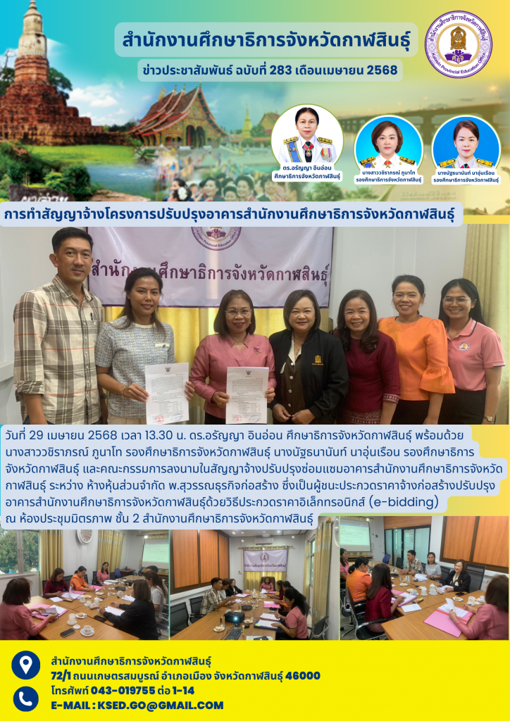 วันที่ 29 เมษายน 2568 เวลา 13.30 น. ดร.อรัญญา อินอ่อน ศึกษาธิการจังหวัดกาฬสินธุ์ พร้อมด้วย นางสาววชิราภรณ์ ภูนาโท รองศึกษาธิการจังหวัดกาฬสินธุ์ นางนัฐธนานันท์ นาอุ่นเรือน รองศึกษาธิการจังหวัดกาฬสินธุ์ และคณะกรรมการลงนามในสัญญาจ้างปรับปรุงซ่อมแซมอาคารสำนักงานศึกษาธิการจังหวัดกาฬสินธุ์ ระหว่าง ห้างหุ้นส่วนจำกัด พ.สุวรรณธุรกิจก่อสร้าง ซึ่งเป็นผู้ชนะประกวดราคาจ้างก่อสร้างปรับปรุงอาคารสำนักงานศึกษาธิการจังหวัดกาฬสินธุ์ด้วยวิธีประกวดราคาอิเล็กทรอนิกส์ (e-bidding) ณ ห้องประชุมมิตรภาพ ชั้น 2 สำนักงานศึกษาธิการจังหวัดกาฬสินธุ์