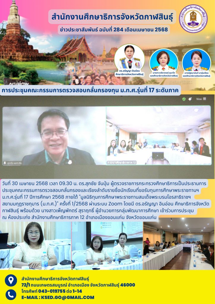 วันที่ 30 เมษายน 2568 เวลา 09.30 น. ดร.สุภชัย จันปุ่ม ผู้ตรวจราชการกระทรวงศึกษาธิการเป็นประธานการประชุมคณะกรรมการตรวจสอบกลั่นกรองและเรียงลำดับรายชื่อนักเรียนที่ขอรับทุนการศึกษาพระราชทานฯ ม.ท.ศ.รุ่นที่ 17 ปีการศึกษา 2568 ภายใต้ “มูลนิธิทุนการศึกษาพระราชทานสมเด็จพระบรมโอรสาธิราชฯ สยามมกุฎราชกุมาร (ม.ท.ศ.)” ครั้งที่ 1/2568 ผ่านระบบ Zoom โดยมี ดร.อรัญญา อินอ่อน ศึกษาธิการจังหวัดกาฬสินธุ์ พร้อมด้วย นางสาวเพ็ญพักตร์ สุราฤทธิ์ ผู้อำนวยการกลุ่มพัฒนาการศึกษา เข้าร่วมการประชุม ณ ห้องประเก่ง สำนักงานศึกษาธิการภาค 12 อำเภอเมืองขอนแก่น จังหวัดขอนแก่น