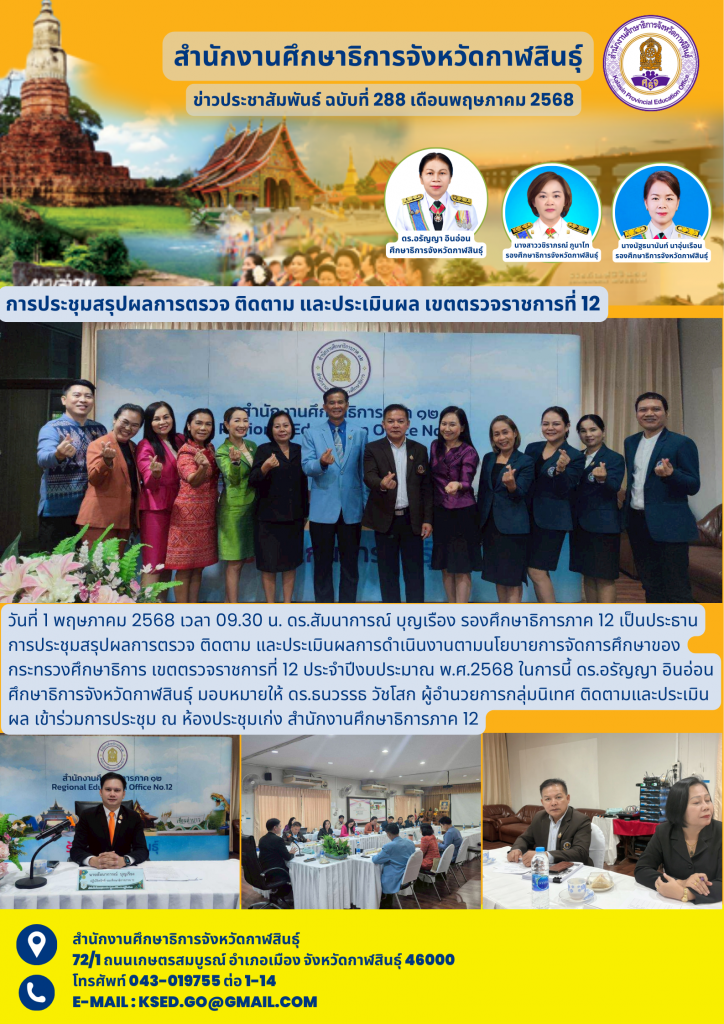 วันที่ 1 พฤษภาคม 2568 เวลา 09.30 น. ดร.สัมนาการณ์ บุญเรือง รองศึกษาธิการภาค 12 เป็นประธานการประชุมสรุปผลการตรวจ ติดตาม และประเมินผลการดำเนินงานตามนโยบายการจัดการศึกษาของกระทรวงศึกษาธิการ เขตตรวจราชการที่ 12 ประจำปีงบประมาณ พ.ศ.2568 ในการนี้ ดร.อรัญญา อินอ่อน ศึกษาธิการจังหวัดกาฬสินธุ์ มอบหมายให้ ดร.ธนวรรธ วัชโสก ผู้อำนวยการกลุ่มนิเทศ ติดตามและประเมินผล เข้าร่วมการประชุม ณ ห้องประชุมเก่ง สำนักงานศึกษาธิการภาค 12
