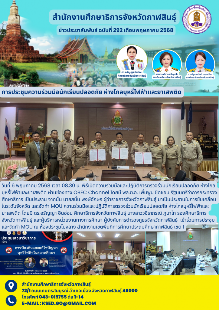 จากนั้น นายสนั่น พงษ์อักษร ผู้ว่าราชการจังหวัดกาฬสินธุ์ มาเป็นประธานในการขับเคลื่อนในระดับจังหวัด และจัดทำ MOU ความร่วมมือและปฏิบัติการตรวจร่วมนักเรียนปลอดภัย ห่างไกลบุหรี่ไฟฟ้าและยาเสพติด โดยมี ดร.อรัญญา อินอ่อน ศึกษาธิการจังหวัดกาฬสินธุ์ ว่าที่ร้อยตรี สุรสิทธิ์ ถิตย์สมบูรณ์ ผู้อำนวยการสำนักงานเขตพื้นที่การศึกษาประถมศึกษากาฬสินธุ์ เขต 1 ดร.วิภา สายรัตน์ ผู้อำนวยการสำนักงานเขตพื้นที่การศึกษามัธยมศึกษากาฬสินธุ์ นางสาววชิราภรณ์ ภูนาโท รองศึกษาธิการจังหวัดกาฬสินธุ์ และผู้บริหารหน่วยงานทางการศึกษา ผู้บังคับการตำรวจภูธรจังหวัดกาฬสินธุ์ เข้าร่วมการประชุมและจัดทำ MOU ณ ห้องประชุมโปงลาง สำนักงานเขตพื้นที่การศึกษาประถมศึกษากาฬสินธุ์ เขต 1