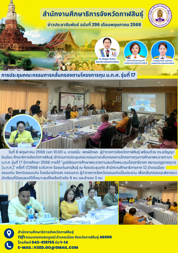 วันที่ 8 พฤษภาคม 2568 เวลา 10.00 น. นายสนั่น พงษ์อักษร ผู้ว่าราชการจังหวัดกาฬสินธุ์ พร้อมด้วย อร.อรัญญา อินอ่อน ศึกษาธิการจังหวัดกาฬสินธุ์ เข้าร่วมการประชุมคณะกรรมการกลั่นกรองตามโครงการทุนการศึกษาพระราชทานฯ ม.ท.ศ. รุ่นที่ 17 ปีการศึกษา 2568 ภายใต้ “มูลนิธิทุนการศึกษาพระราชทานสมเด็จพระบรมโอรสาธิราชฯ สยามมกุฎราชกุมาร (ม.ท.ศ.)” ครั้งที่ 1/2568 ระดับภาค ร้อยแก่นสารสินธุ์ ณ ห้องประชุมเก่ง สำนักงานศึกษาธิการภาค 12 อำเภอเมืองขอนแก่น จังหวัดขอนแก่น โดยมีนายไกรสร กองฉลาด ผู้ว่าราชการจังหวัดขอนแก่นเป็นประธาน เพื่อกลั่นกรองและพิจารณานักเรียนที่มีคุณสมบัติที่เหมาะสมให้เหลือตัวจริง 8 คน และสำรอง 3 คน