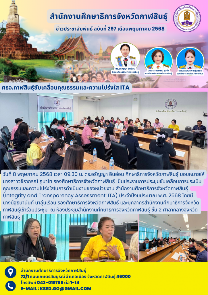 วันที่ 8 พฤษภาคม 2568 เวลา 09.30 น. ดร.อรัญญา อินอ่อน ศึกษาธิการจังหวัดกาฬสินธุ์ มอบหมายให้ นางสาววชิราภรณ์ ภูนาโท รองศึกษาธิการจังหวัดกาฬสินธุ์ เป็นประธานการประชุมขับเคลื่อนการประเมินคุณธรรมและความโปร่งใสในการดำเนินงานของหน่วยงาน สำนักงานศึกษาธิการจังหวัดกาฬสินธุ์ (Integrity and Transparency Assessment: ITA) ประจำปีงบประมาณ พ.ศ. 2568 โดยมี นางนัฐธนานันท์ นาอุ่นเรือน รองศึกษาธิการจังหวัดกาฬสินธุ์ และบุคลากรสำนักงานศึกษาธิการจังหวัดกาฬสินธุ์เข้าร่วมประชุม ณ ห้องประชุมสำนักงานศึกษาธิการจังหวัดกาฬสินธุ์ ชั้น 2 ศาลากลางจังหวัดกาฬสินธุ์