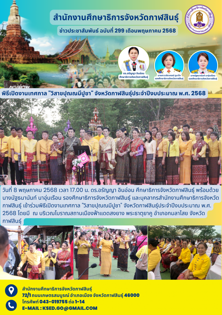 วันที่ 8 พฤษภาคม 2568 เวลา 17.00 น. ดร.อรัญญา อินอ่อน ศึกษาธิการจังหวัดกาฬสินธุ์ พร้อมด้วย นางนัฐธนานันท์ นาอุ่นเรือน รองศึกษาธิการจังหวัดกาฬสินธุ์ และบุคลากรสำนักงานศึกษาธิการจังหวัดกาฬสินธุ์ เข้าร่วมพิธีเปิดงานเทศกาล “วิสาขปุณณมีปูชา” จังหวัดกาฬสินธุ์ประจำปีงบประมาณ พ.ศ. 2568 โดยมี ณ บริเวณโบราณสถานเมืองฟ้าแดดสงยาง พระธาตุยาคู อำเภอกมลาไสย จังหวัดกาฬสินธุ์