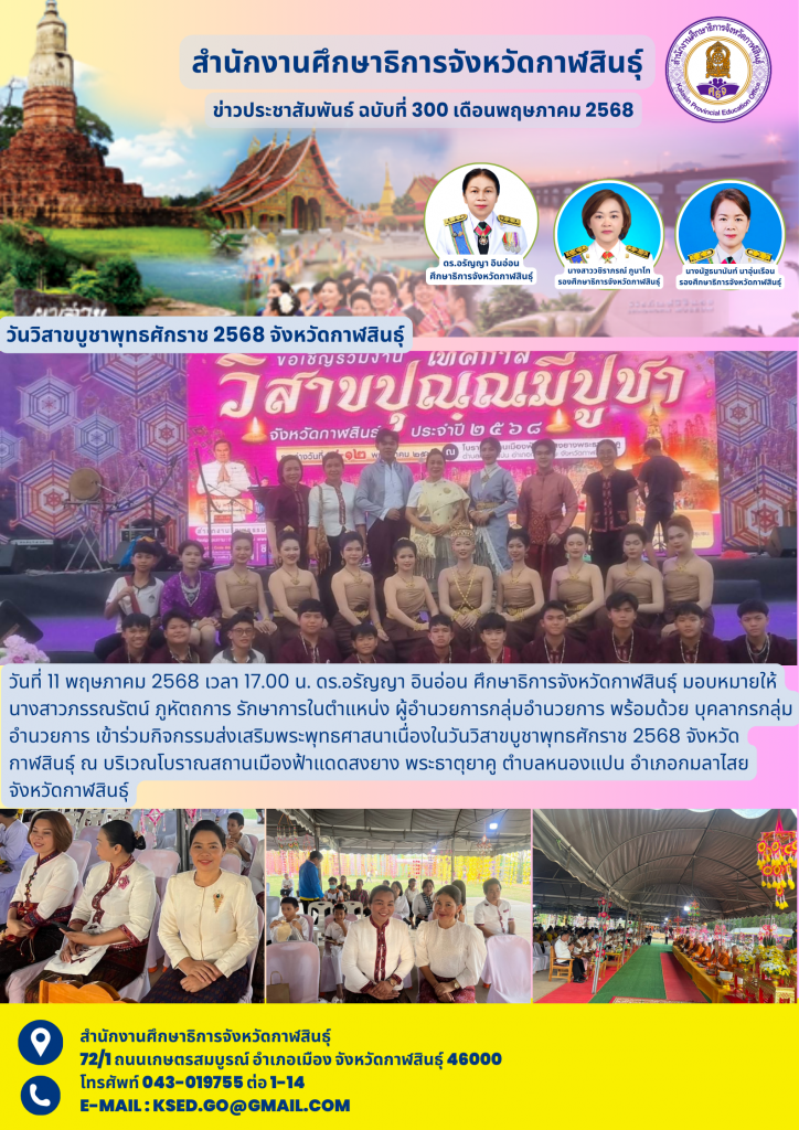 วันที่ 11 พฤษภาคม 2568 เวลา 17.00 น. ดร.อรัญญา อินอ่อน ศึกษาธิการจังหวัดกาฬสินธุ์ มอบหมายให้ นางสาวภรรณรัตน์ ภูหัตถการ รักษาการในตำแหน่ง ผู้อำนวยการกลุ่มอำนวยการ พร้อมด้วย บุคลากรกลุ่มอำนวยการ เข้าร่วมกิจกรรมส่งเสริมพระพุทธศาสนาเนื่องในวันวิสาขบูชาพุทธศักราช 2568 จังหวัดกาฬสินธุ์ ณ บริเวณโบราณสถานเมืองฟ้าแดดสงยาง พระธาตุยาคู ตำบลหนองแปน อำเภอกมลาไสย จังหวัดกาฬสินธุ์